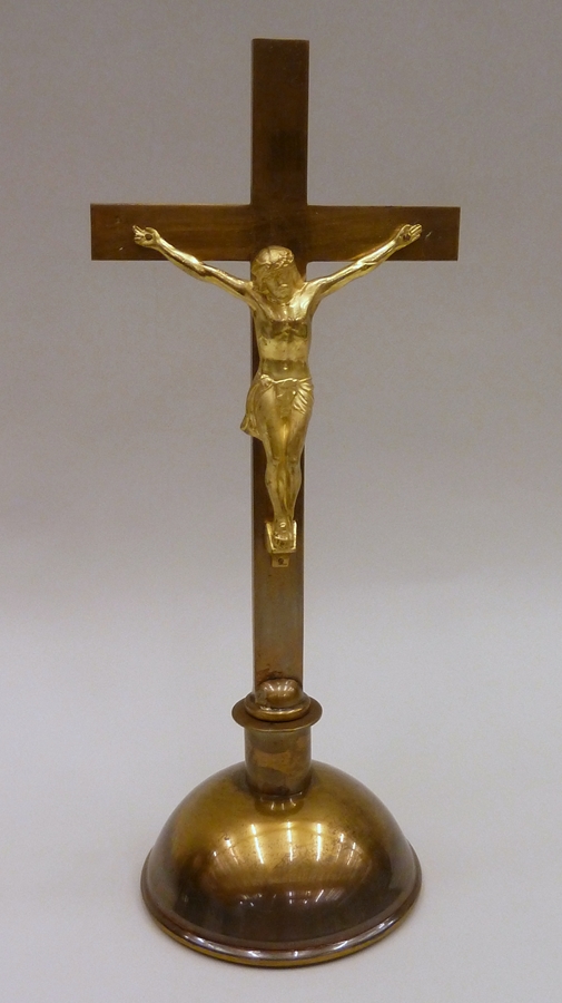 Kruisbeeld op bolle voet, bij aalmoezenierskoffer