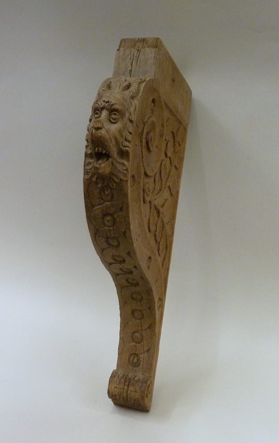 Console van een koorgestoelte met gehoornd masker, blad op de kop, baard uit bladornament