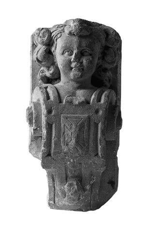 Fragment pilaster(?) met voluut met plattebandornament en buste