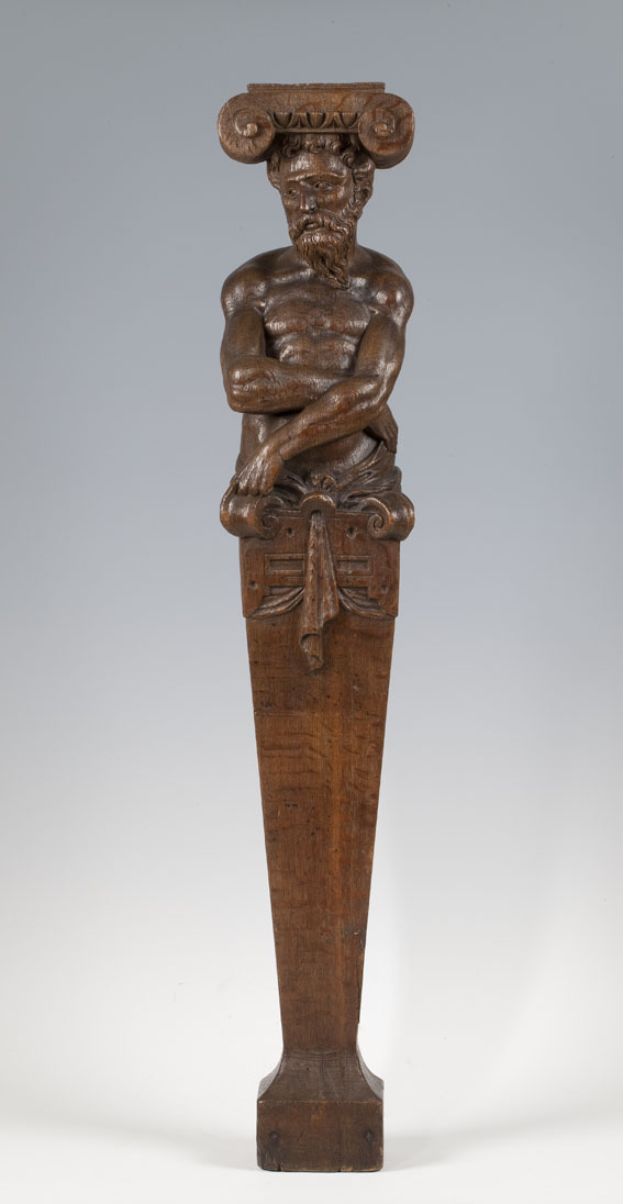 De herme bestaat uit naar onderen toe taps toelopende, vierkante pijler waaruit een mannelijke halffiguur oprijst die een ionisch kapiteel op zijn hoofd draagt. Het onderste, onversierde gedeelte van de pijler rust een op een vierkante voet. Langs de bovenrand is de pijler versierd met een rand plattebandornament met voluten op de hoeken. De halffiguur ...