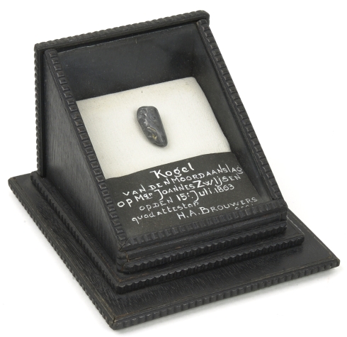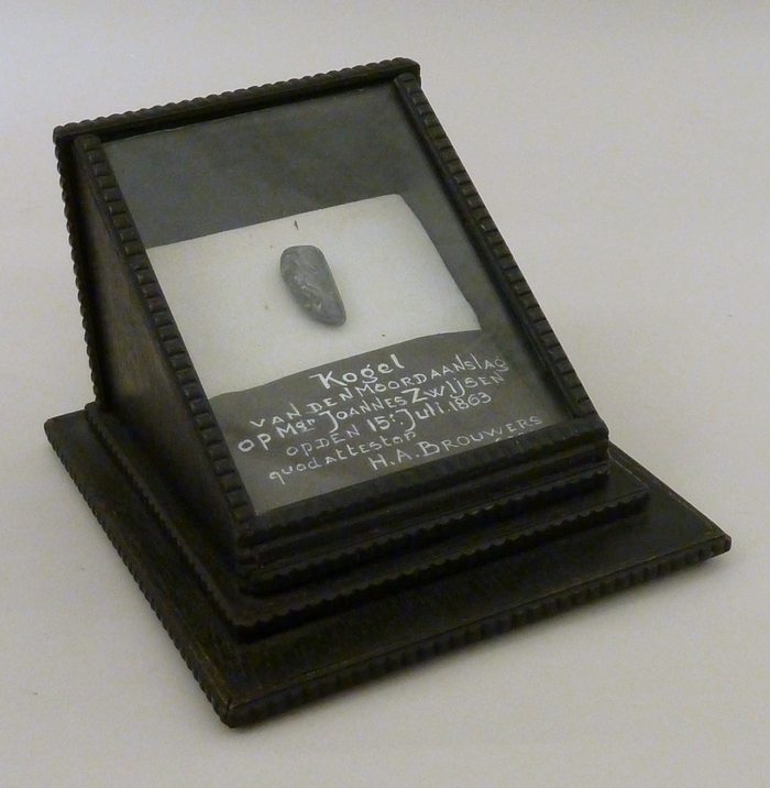 Kogel van de moordaanslag op Mgr. Johannes Zwijsen 15 juli 1863, in houten doosje