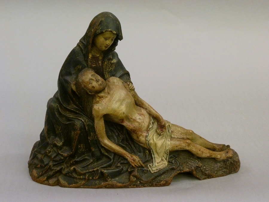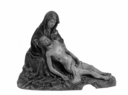 Maria zit op een rots die met fijne groeven is aangeduid. Zij heeft haar bovenlichaam driekwart naar rechts gedraaid en zit enigszins gebogen over het lichaam van Christus, dat in halfzittende houding tegen haar knie rust en door haar met beide handen wordt ondersteund. Met haar rechterhand ondersteunt ze zijn hoofd; haar linkerhand rust op ...