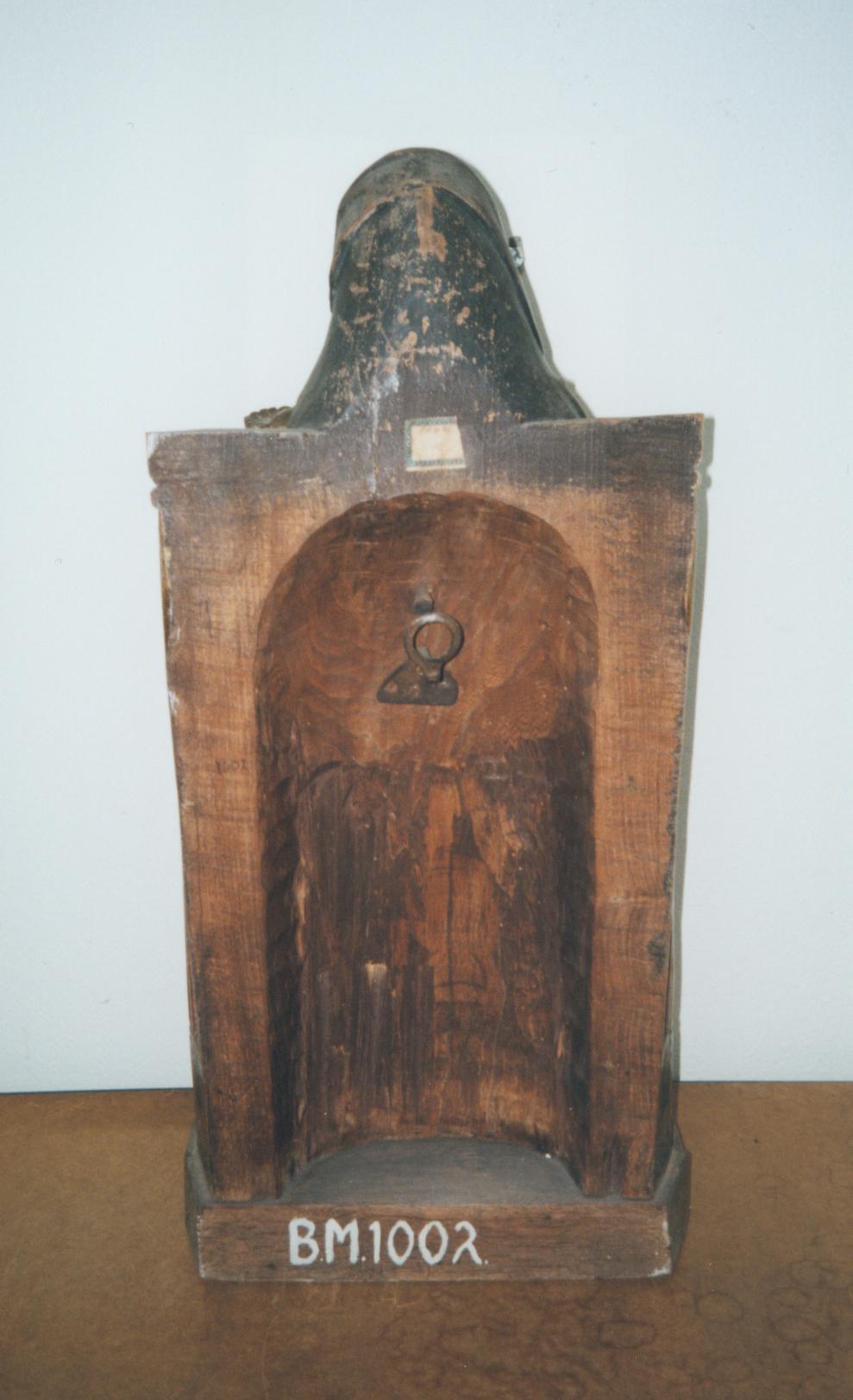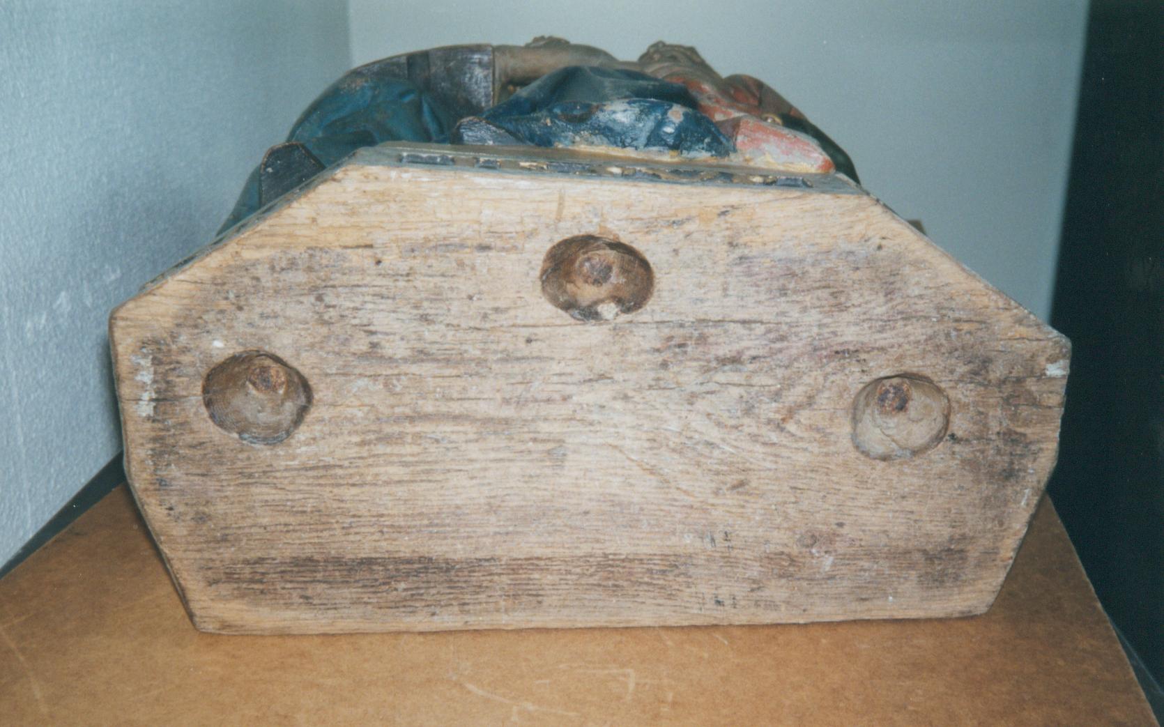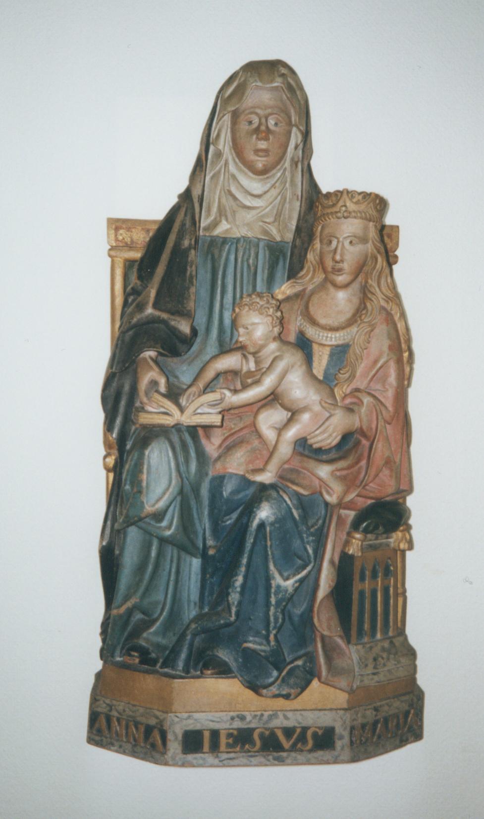 Anna zit in een grote zetel met gotische traceringen en heeft haar linkerarm om Maria geslagen die rechts voor haar, op een lager bankje, op een kussentje zit. Maria is driekwart naar links gewend en steunt het naakte Christuskind dat op haar schoot zit bij de borst en de heup. Het kind bladert in een ...