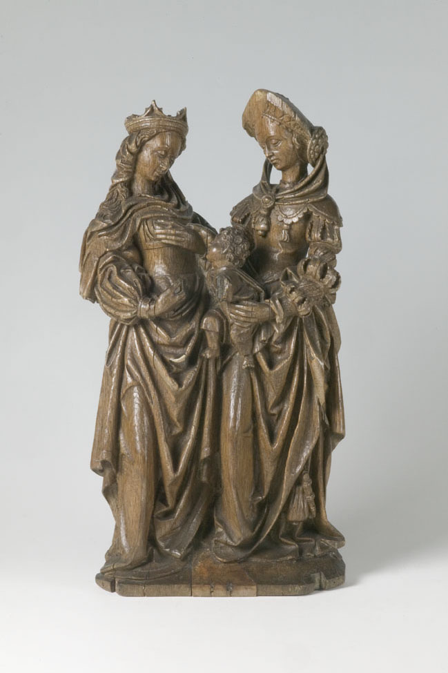 Links staat Maria en rechts staat Anna. Ze zijn naar elkaar toegewend en kijken beiden naar het Christuskind tussen hen in. Anna houdt met twee handen het Christuskind voor zich vast. Ze heeft haar rechterbeen naar voren geplaatst. Het kind heeft het bovenlichaam naar links gewend en kijkt op naar Maria, terwijl hij met zijn ...