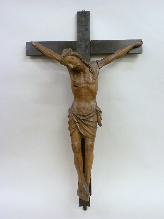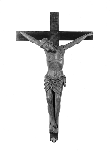Christus hangt gestorven aan het kruis. Zijn hoofd rust op zijn rechterschouder. De mond is half geopend en zijn gekrulde lokken vallen over zijn borst. Een grote, gesmede, ijzeren nagel is door zijn voeten geslagen; de rechtervoet is over de linker gespijkerd. Hij is met de lendendoek bekleed, die strak om zijn heupen is gebonden. ...