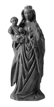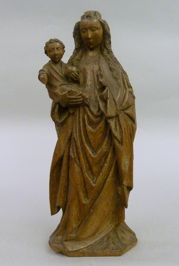 Maria is staande voorgesteld, rustend op haar linkerbeen. Zij draagt het Christuskind op haar rechterarm. Haar hoofd met lange, krullende lokken is iets naar links gewend. Het kind zit rechtop en houdt in zijn linkerhand de wereldbol. Zijn gezicht is naar de beschouwer gewend. Zijn rechterbeentje rust op Maria's hand en zijn linkerbeentje is gebogen ...