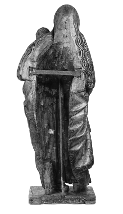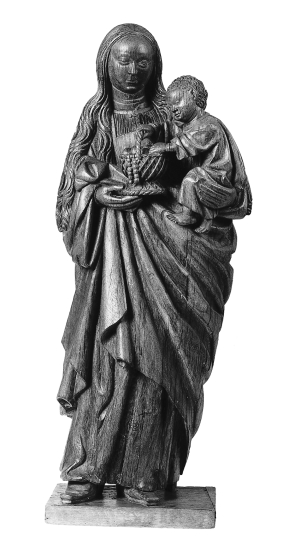 Maria is staande voorgesteld, rustend op haar linkerbeen. Zij draagt het kind op haar linkerarm. In haar rechterhand houdt zij een mandje met vruchten waaruit een rozenkrans hangt. Het kind grijpt met zijn linkerhandje naar de vruchten, terwijl het met zijn rechter het hengsel van het mandje vasthoudt. Maria's lange golvende haar valt over haar ...