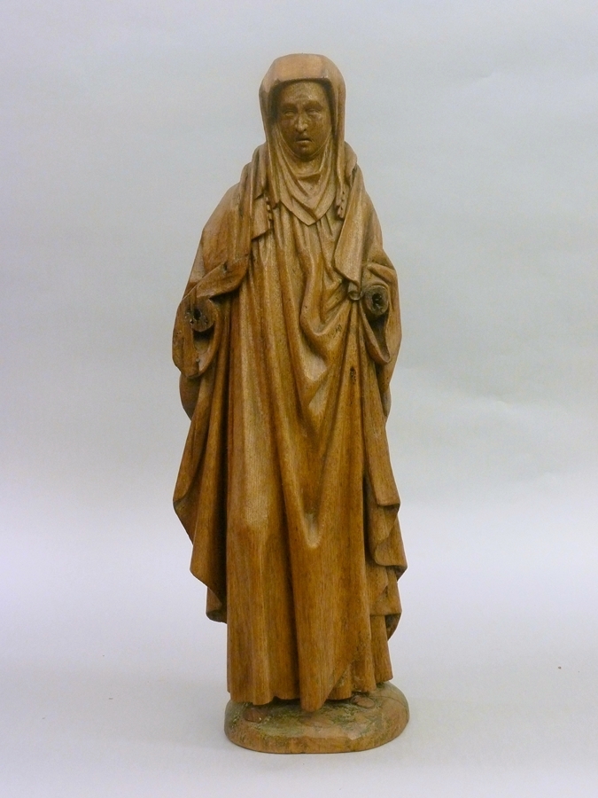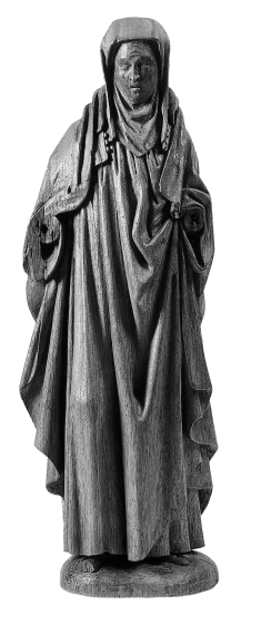 Vrouwelijke heilige, frontaal, afhangend gewaad, hoofddoek, kinlap en sluier