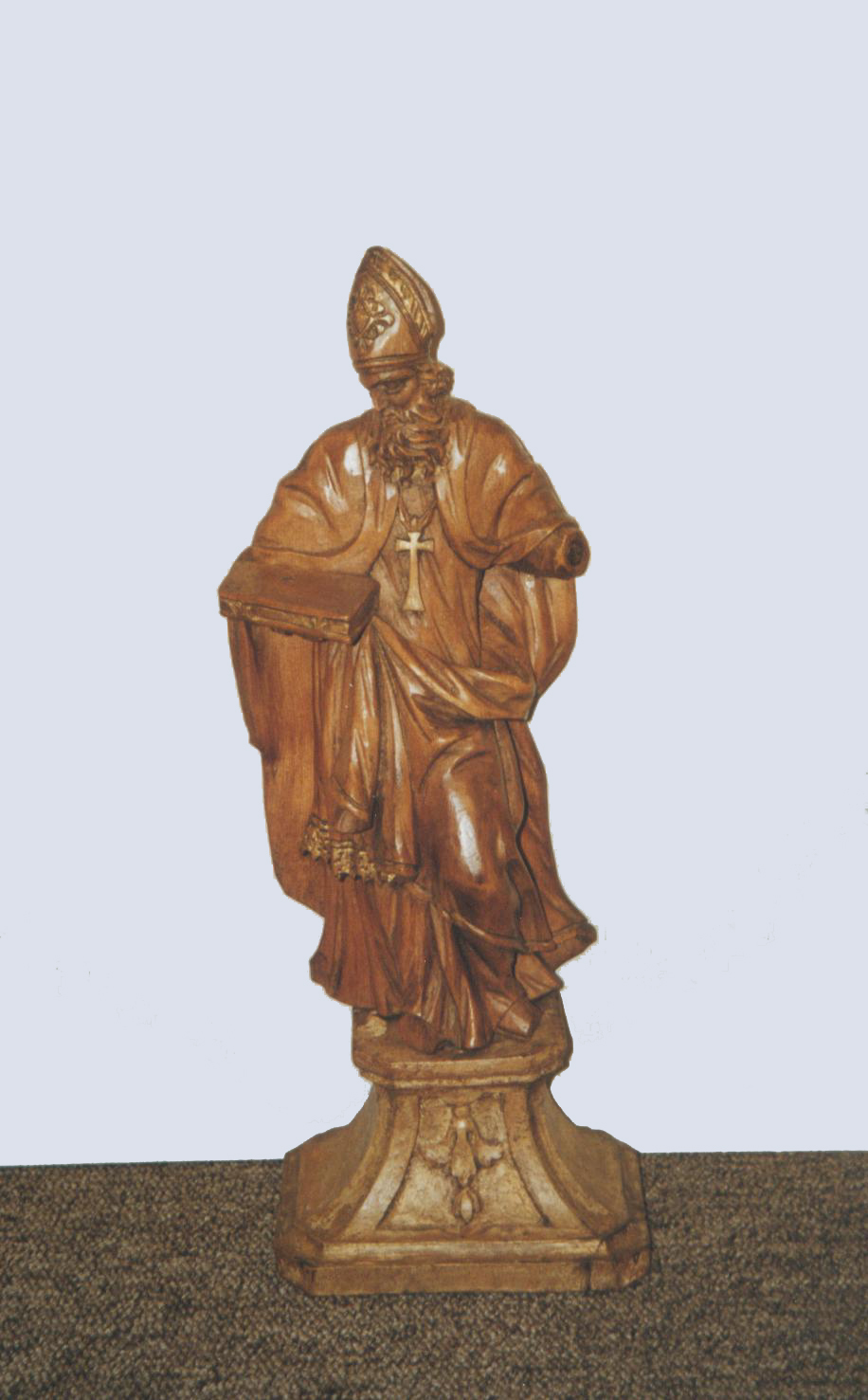 H. bisschop, kerkvader(?) met mijter, borstkruis, lange baard, in rechterhand gesloten boek