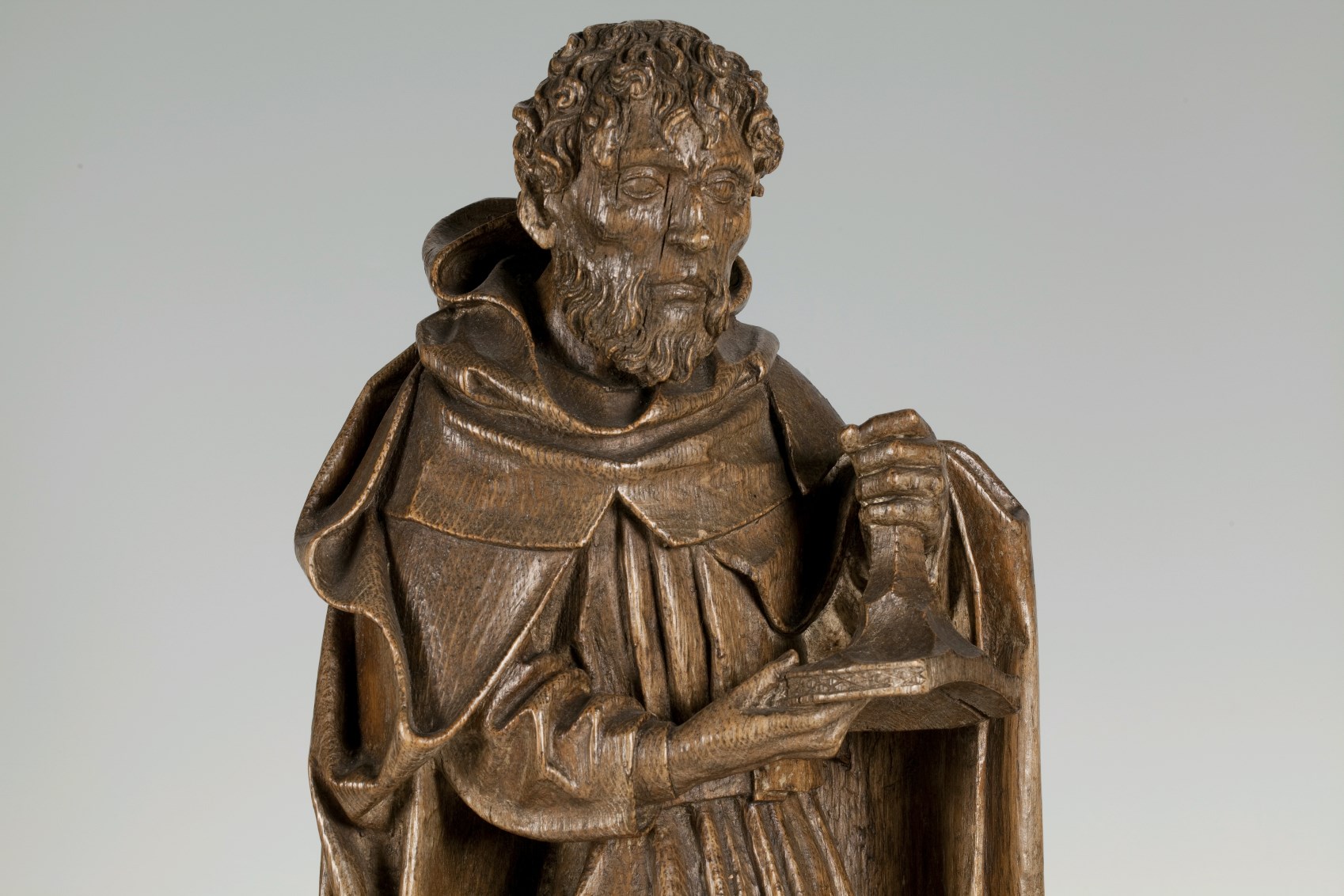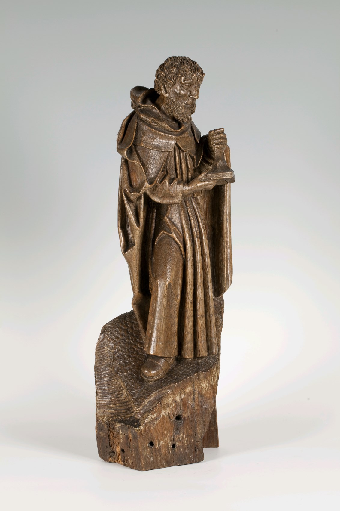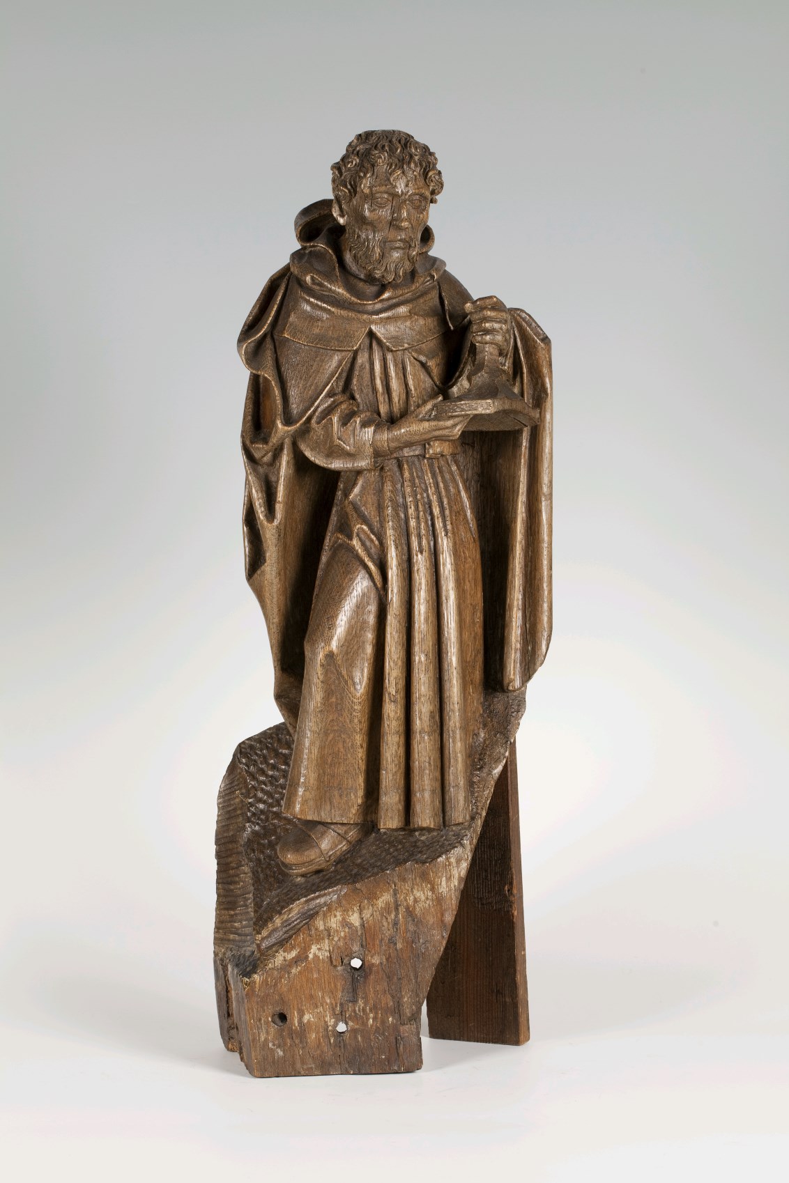De heilige is staande voorgesteld, rustend op zijn linkerbeen en met vooruitgeschoven rechterbeen. In beide handen houdt hij een kelk of kandelaar, waarvan hij de voet met zijn rechterhand ondersteunt. Hij staat op een met kleine groefjes aangeduide, schuin aflopende grond, die de suggestie van gras wekt. Over een aan de polsen zichtbaar onderkleed, draagt ...