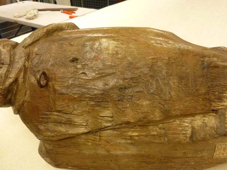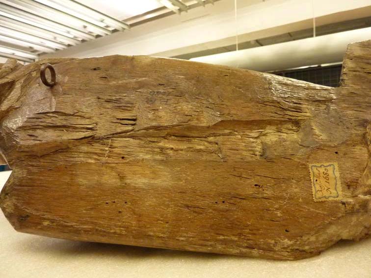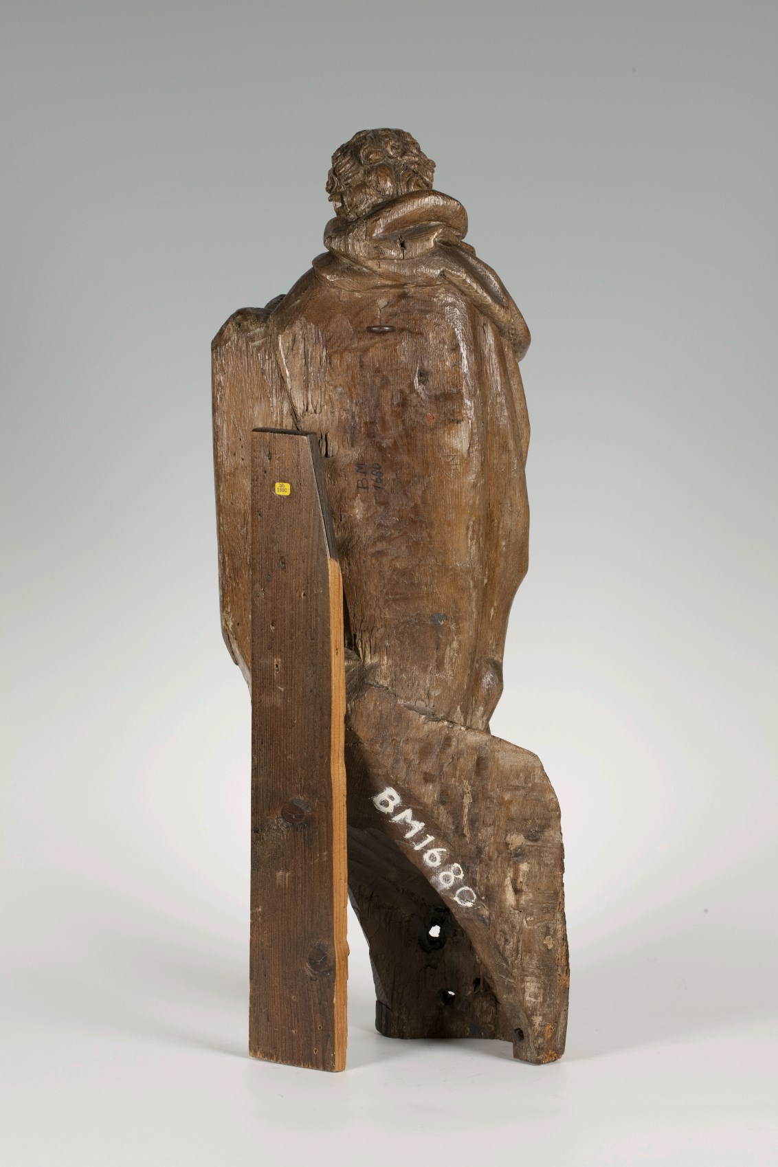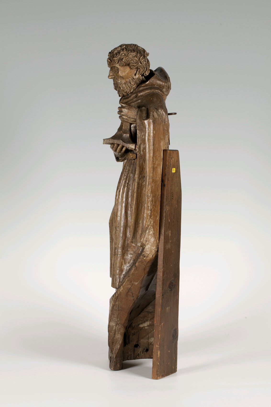 De heilige is staande voorgesteld, rustend op zijn linkerbeen en met vooruitgeschoven rechterbeen. In beide handen houdt hij een kelk of kandelaar, waarvan hij de voet met zijn rechterhand ondersteunt. Hij staat op een met kleine groefjes aangeduide, schuin aflopende grond, die de suggestie van gras wekt. Over een aan de polsen zichtbaar onderkleed, draagt ...