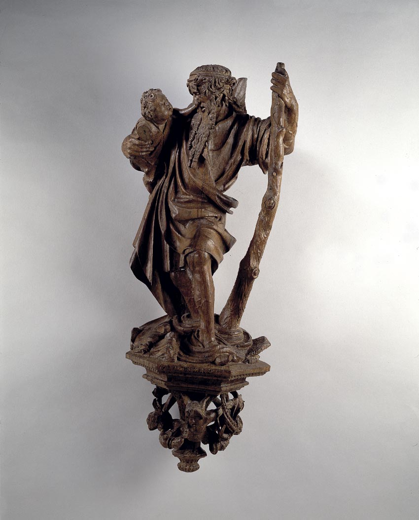 Christoffel is staande voorgesteld, terwijl hij door het water waadt. Hij draagt in zijn rechterarm het Christuskind, dat op zijn uitgebogen rechterheup steunt. Met zijn linkerhand omklemt hij de boomstam waarop hij steunt. Het kind pakt met zijn linkerhand het haar van Christoffel vast. Christoffel draagt een korte tunica en eroverheen een mantel, die over ...