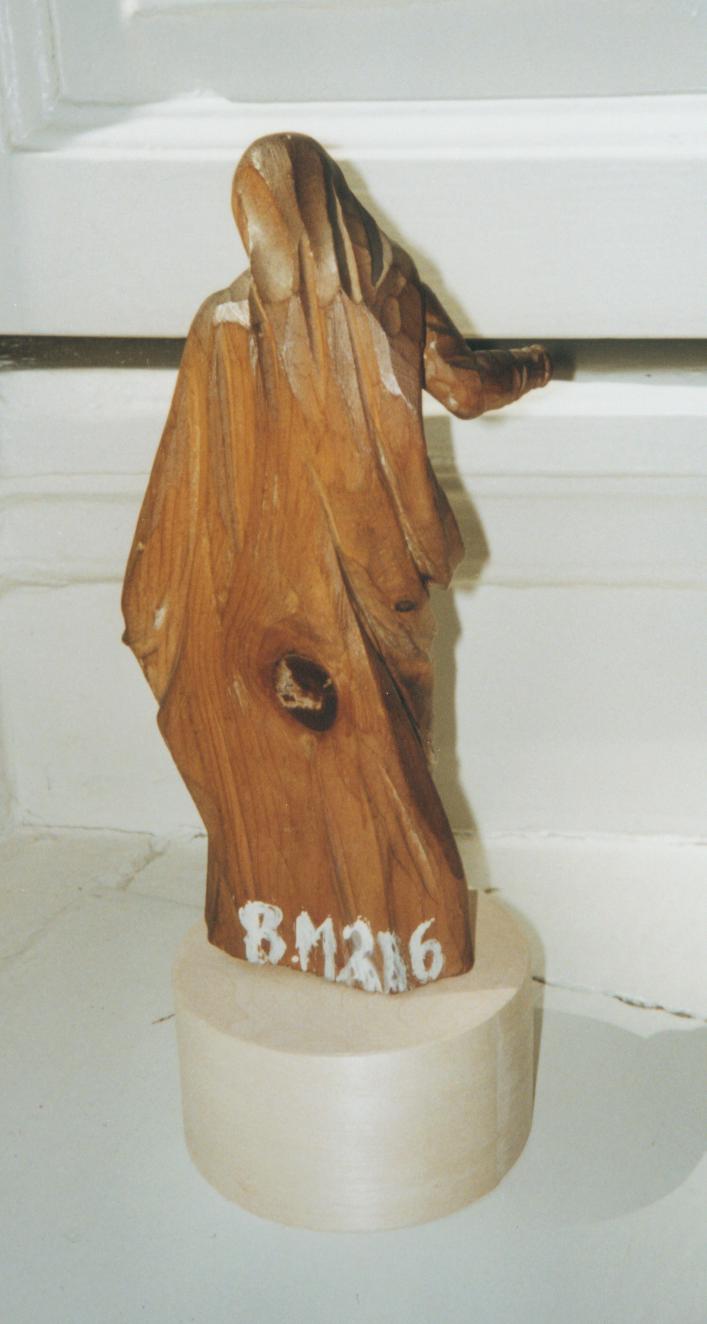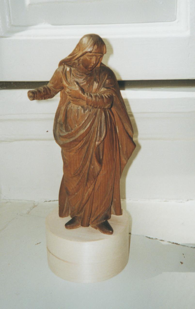 Maria is staand weergegeven. Zij rust op haar linkerbeen en houdt haar linkerhand op de borst. Ze heeft het hoofd driekwart naar rechts gewend en kijkt naar beneden. Ze heeft haar rechterarm iets opgeheven. Maria is gekleed in een lang, omgord gewaad, waarover een mantel. Deze is over haar hoofd geslagen en onder haar rechterarm ...