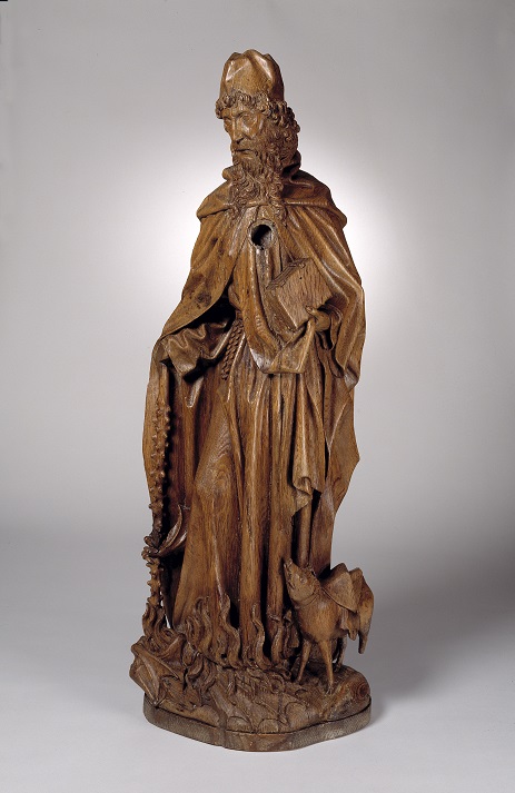 Antonius is staande afgebeeld met vooruitgeschoven rechterbeen. Hij heeft zijn hoofd naar links gewend. Onder zijn voeten een op de rug liggend hellemonster, waarvan de vlammen langs zijn gewaad lekken. De staf, die hij in zijn nu verdwenen rechterhand hield, stoot hij in de opengesperde, vuurspuwende muil van het beest. Deze omklemt de staf met ...