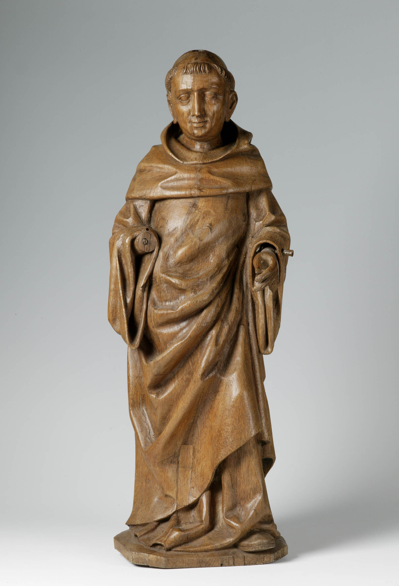 De monnik is staande voorgesteld, rustend op zijn rechterbeen. Hij heeft zijn nu verdwenen rechterhand geheven en in zijn linkerhand droeg hij een nu verdwenen attribuut (staf?). Hij staat op een grondje. Hij is gehuld in een lang gewaad met daaroverheen een pij met schoudermantel en kap. De wijd neerhangende mouwen zijn teruggeslagen. Hij heeft ...