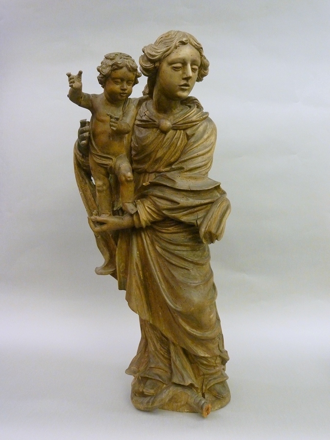 Maria met kind, staande op haar linkerarm, met haar linkervoet slang vertrappend