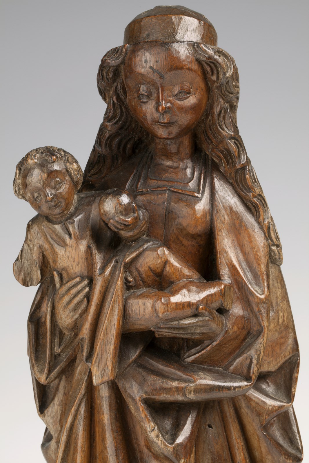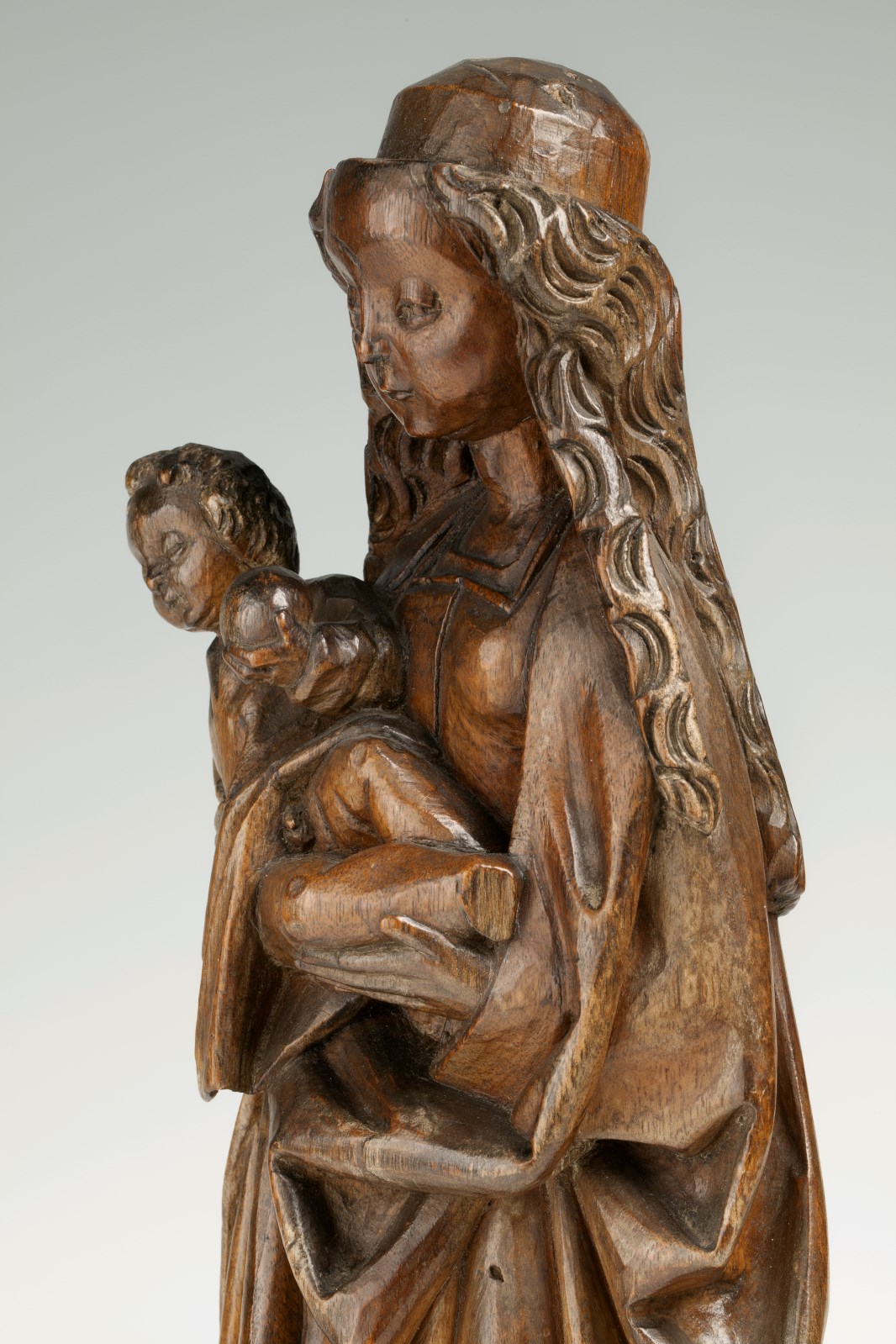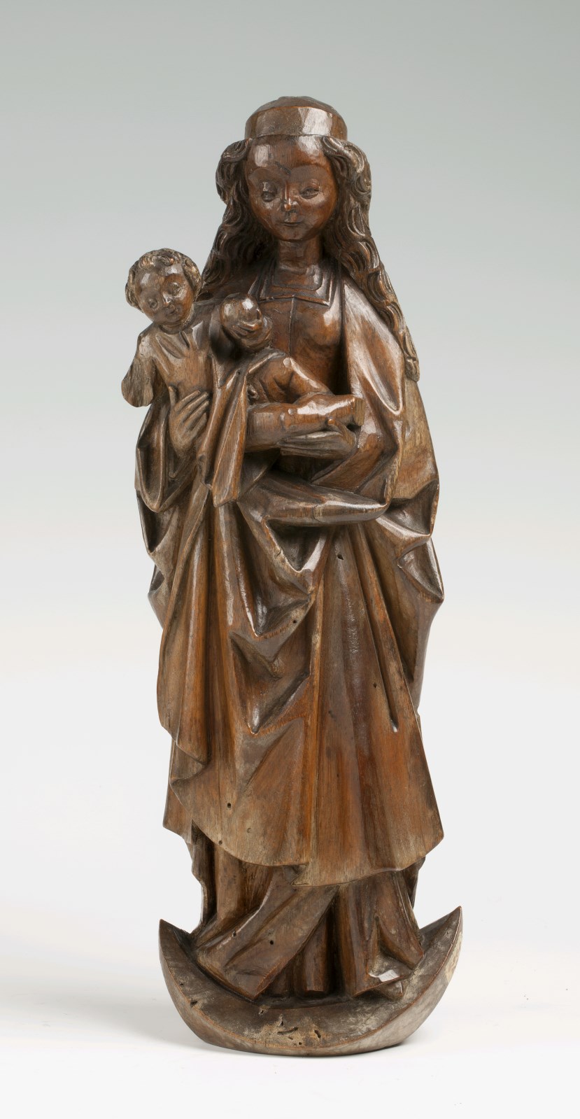 Maria staat op de maansikkel en rust op haar rechterbeen. Ze draagt het Christuskind op haar rechterarm en houdt het met beide handen vast. Het kind is in halfzittende houding naar de beschouwer gekeerd en draagt een appel(?) in zijn linkerhandje. Maria draagt een boven- en een onderkleed met vierkante halsuitsnijdingen. Het bovenkleed heeft twee ...