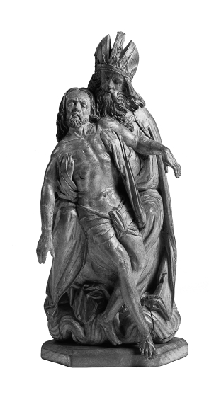 God de Vader zit op de wolken en houdt het lichaam van de gestorven Christus voor zich, terwijl hij het onder de armen steunt. Zijn beide handen zijn met een doek bedekt waarop tevens het lichaam van Christus rust. Christus steunt met zijn hoofd op Gods rechterschouder en met zijn heupen op diens schoot. Zijn ...
