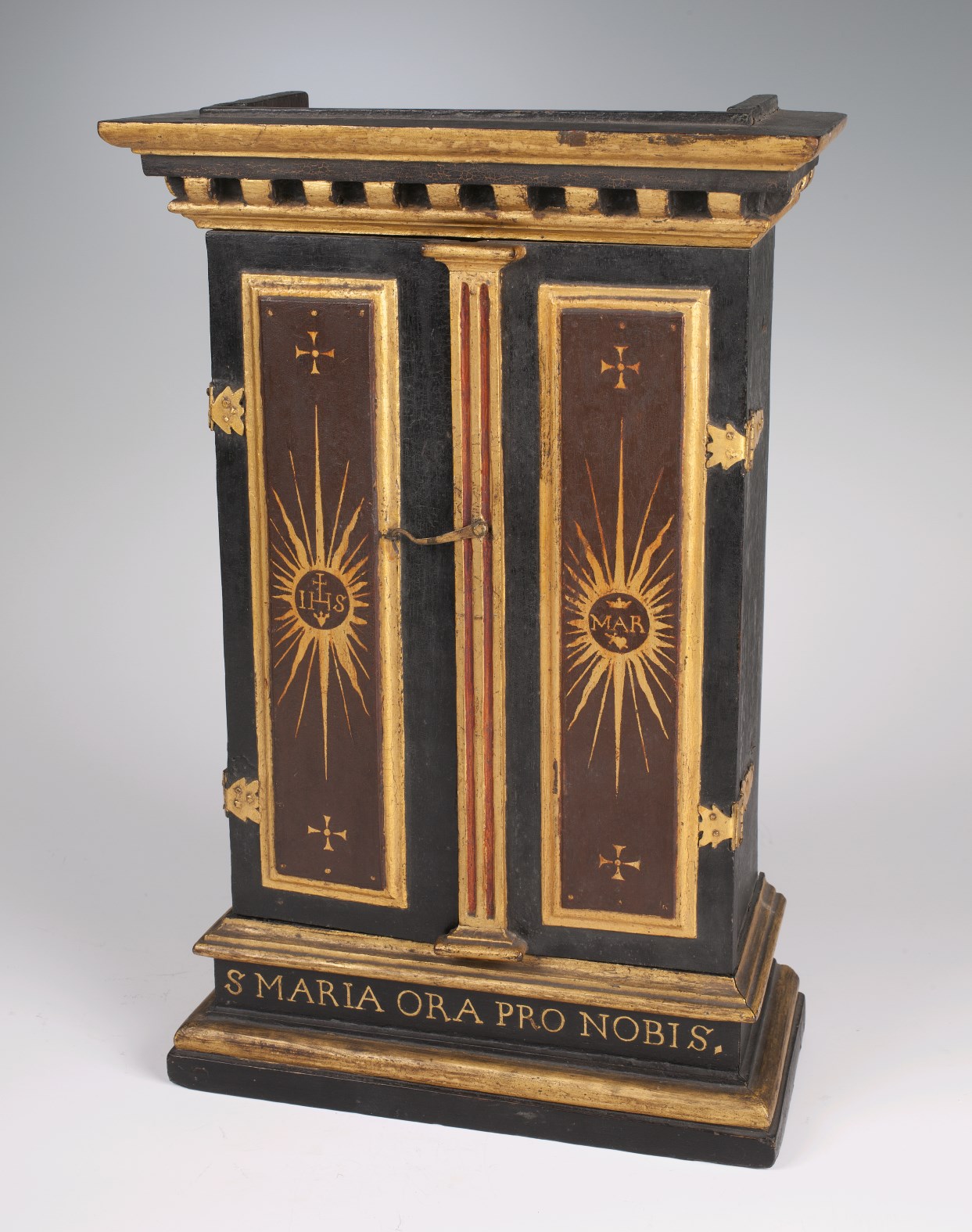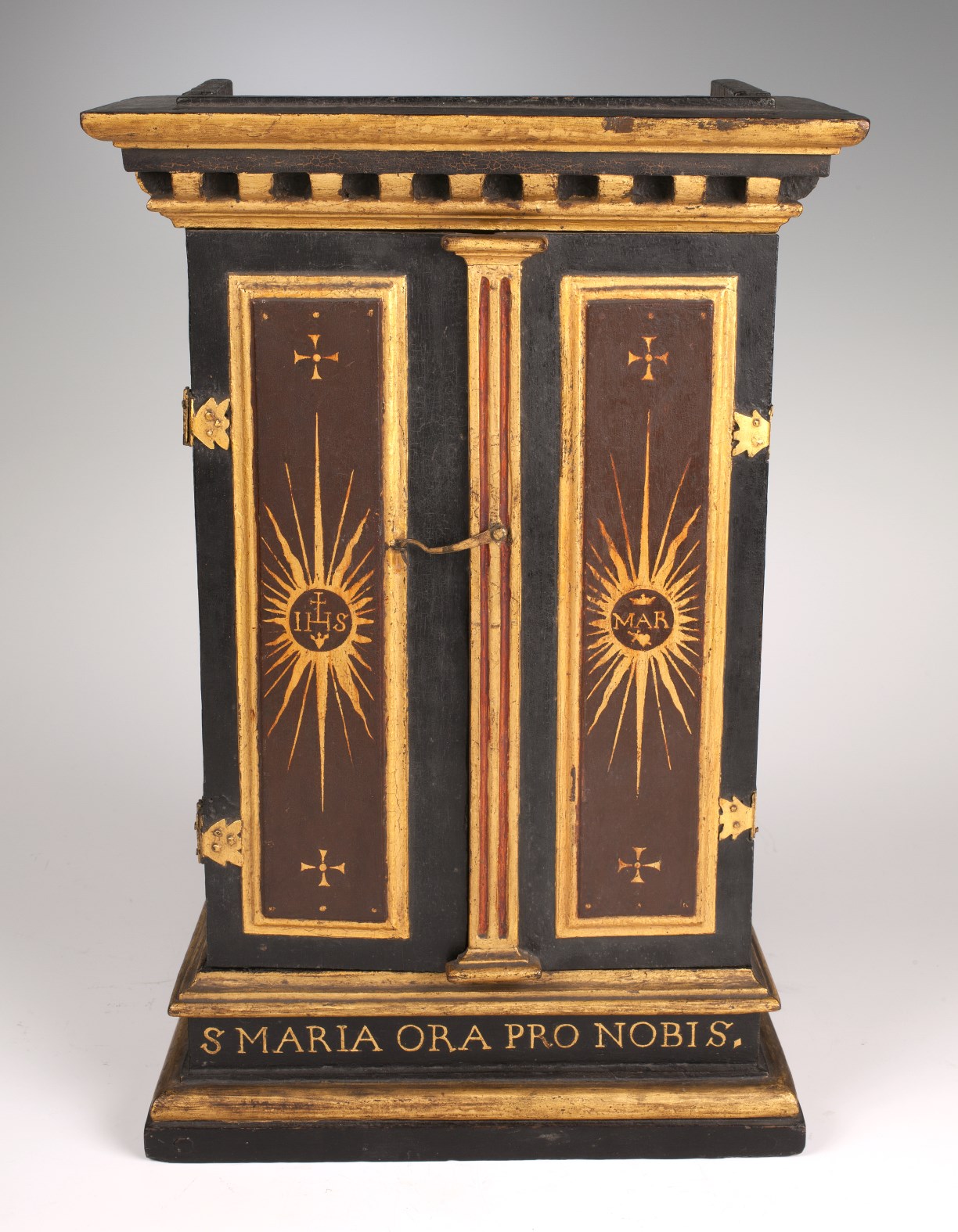 Op de binnenzijde van de deurtjes de tekst: "Sancta Maria, succurre miseris, iuva pusillanimes, refove flebiles, ora pro populo, interveni pro clero, intercede pro devote femineo sexu, sentiant omnes tuum iuvamen quicumque celebrant tuam sanctam commemorationem." Op de voet de tekst: "S. Maria ora pro nobis."