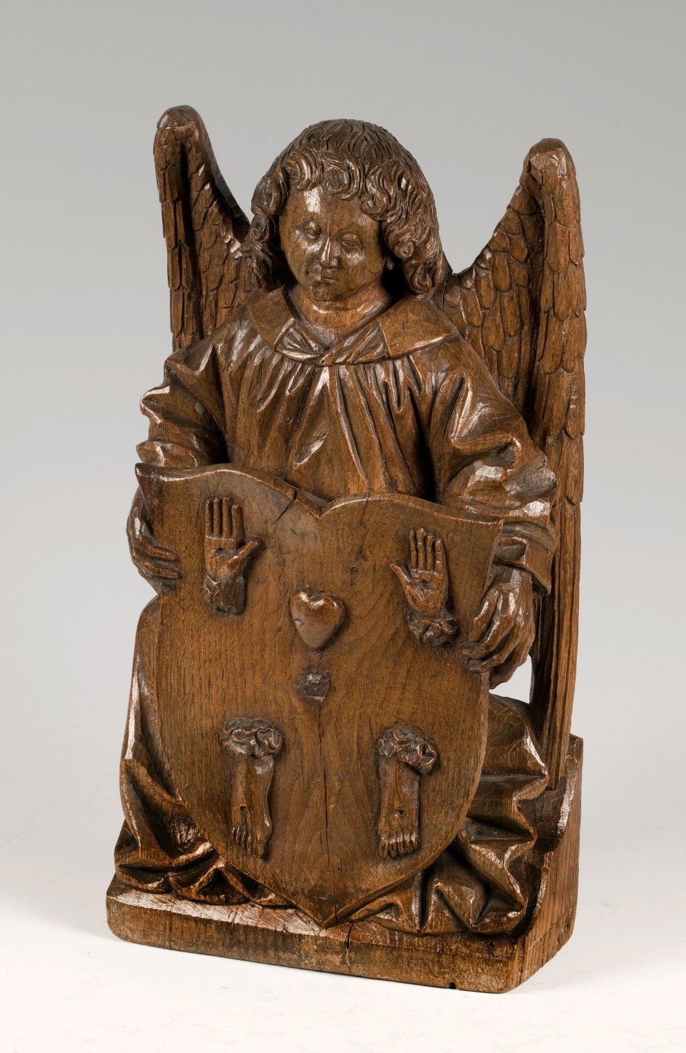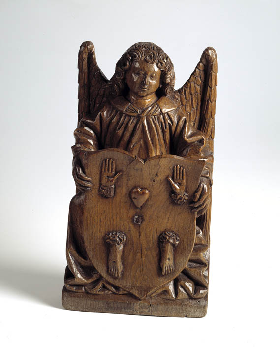 Engel met schild waarop hart, doorboorde handen en voeten van Christus
