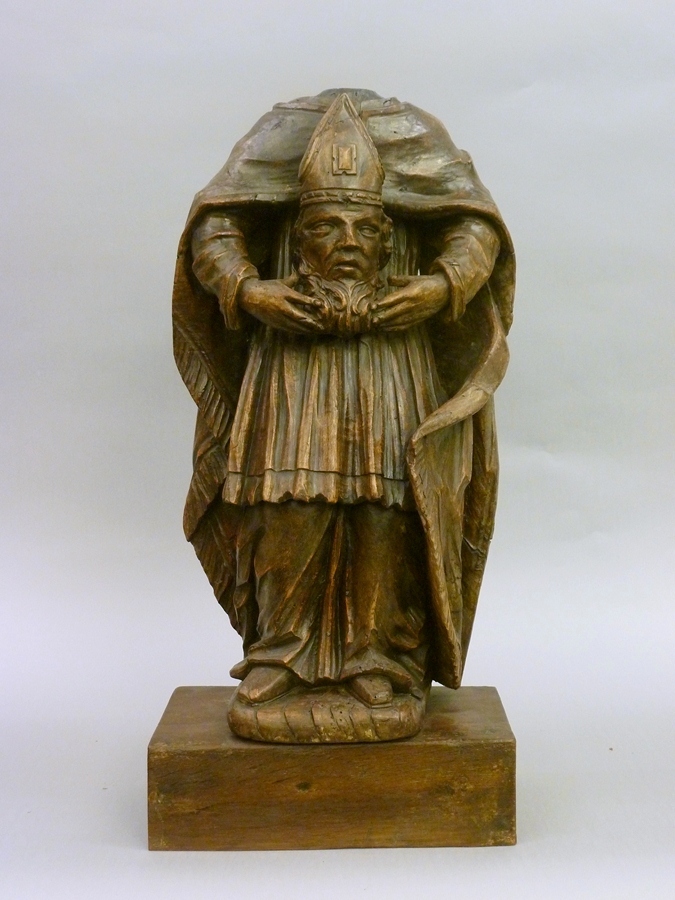De heilige is frontaal staand voorgesteld, het rechterbeen iets gebogen. Zijn afgehouwen hoofd houdt hij met beide handen voor zich vast ter hoogte van zijn buik. De figuur staat op een afgerond grondje. Onder het beeld is een rechthoekige sokkel van later datum aangebracht. De heilige is gekleed in een knielange superplie waarover een koormantel. ...