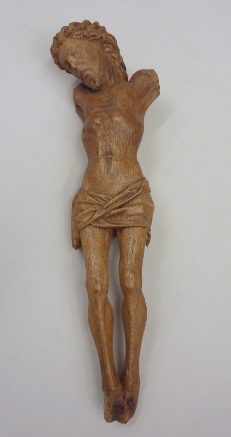 De gestorven Christus hangt uitgestrekt aan het (verdwenen) kruis. Zijn voeten zijn over elkaar heengespijkerd, de rechter over de linker. Zijn hoofd neigt naar links. Hij heeft een kleine puntbaard. Zijn ogen zijn halfgesloten en zijn mond is iets geopend. Christus is met de lendendoek bekleed, waarvan aan de rechterzijde een slip afhangt. Op het ...
