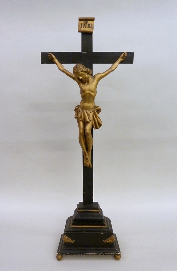 Staand, zwart geschilderd kruis met verguld corpus, op voetstuk twee vergulde cherubs