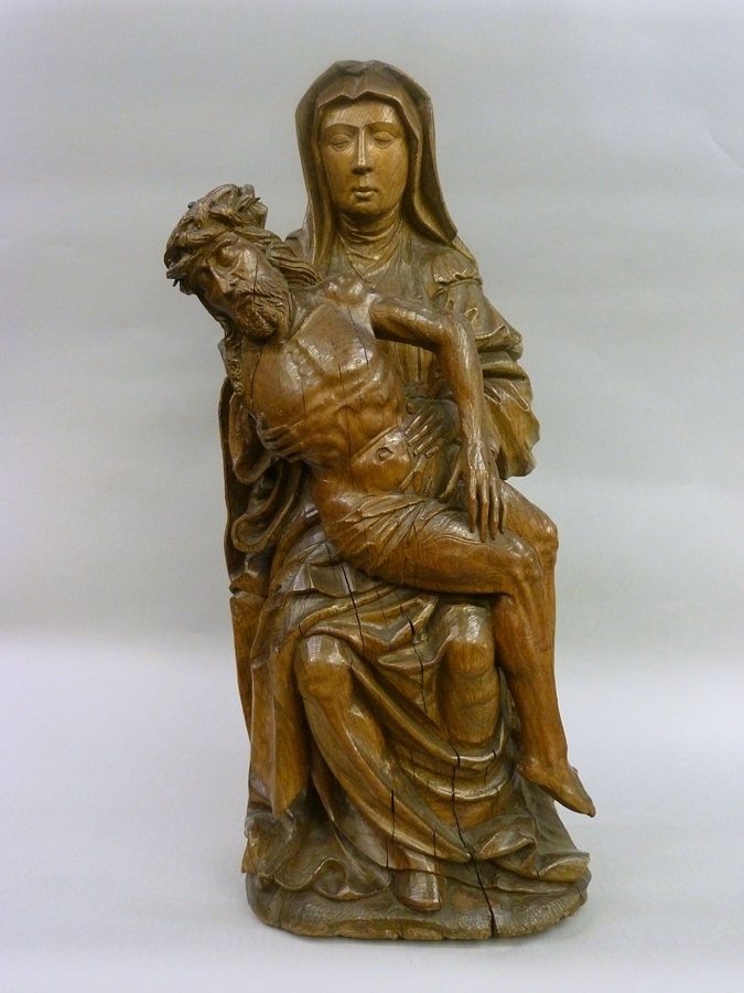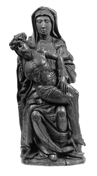 Maria zit op een heuvel. Het dode lichaam van Christus rust in zittende houding op haar schoot. Christus' hoofd en bovenlichaam zijn naar links gezakt en zijn vrijwel frontaal naar de beschouwer gewend; zijn gebogen benen zijn en profil naar rechts weergegeven. Maria ondersteunt met haar rechterhand zijn bovenlichaam, haar linkerhand rust op zijn heup. ...