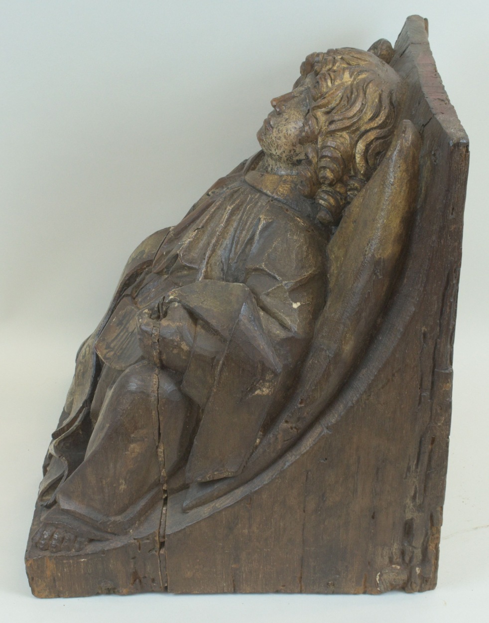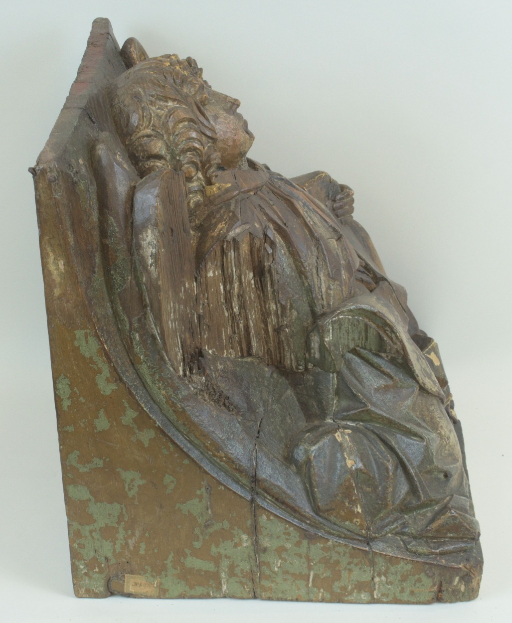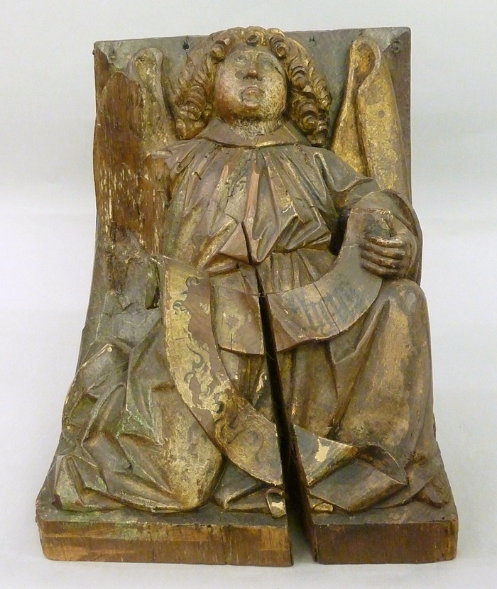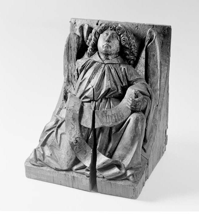 Op de schuine onderzijde van de console is het gevleugelde symbool van de evangelist Mattheus afgebeeld: de mens. Hij steunt op zijn rechterknie. Zijn bovenlichaam en gezicht zijn vrijwel frontaal afgebeeld, zijn benen en profil naar rechts. Hij houdt een banderol vast, waarvan het linkeruiteinde naar rechts terugslaat en neerhangt bij zijn linkervoet. Zijn nu ...