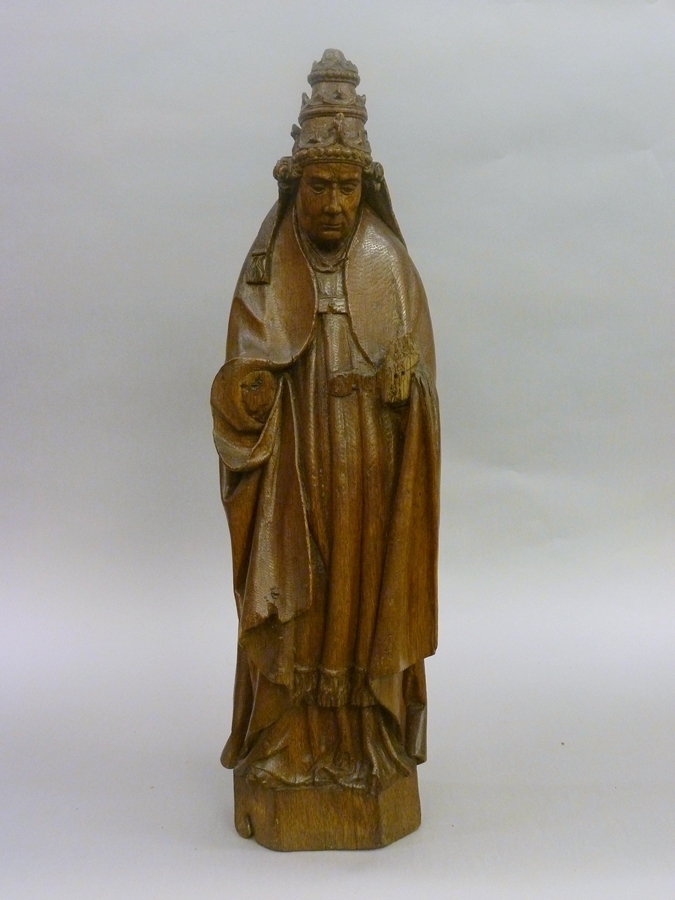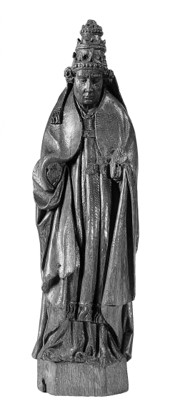 De heilige paus is staande voorgesteld, rustend op zijn linkerbeen. In zijn nu verdwenen rechterhand hield hij mogelijk de pauselijke kruisstaf. In zijn eveneens verdwenen linkerhand droeg hij mogelijk een gesloten boek. Een restant van een boekband lijkt nog aanwezig. De heilige staat op een hoog, zeskantig voetstuk. Hij is gekleed in pauselijk ornaat: tiara, ...