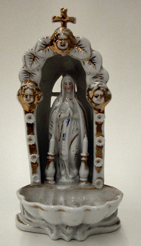 Wijwaterbak met staande Maria met daarvoor kaarsen in kapelletje met achtervenster