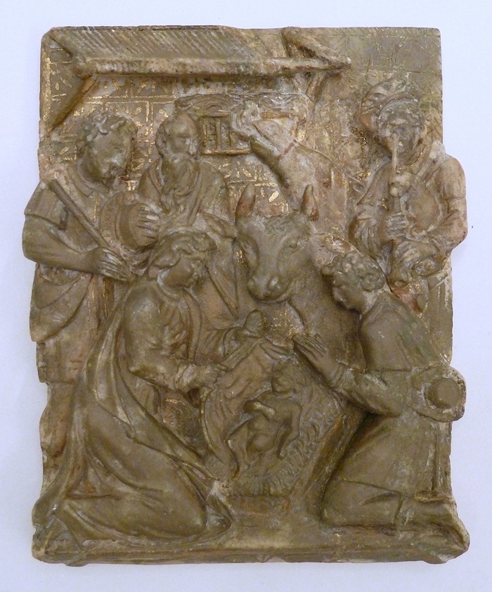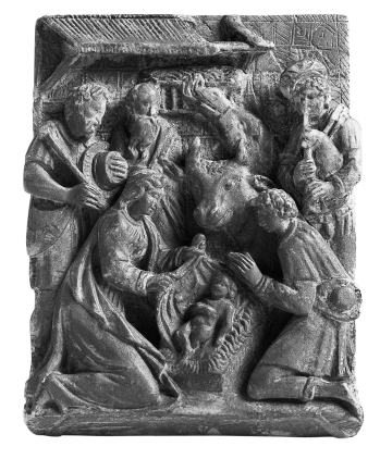 In een stal ligt in het midden op de voorgrond het naakte Christuskind in een kribbe. Links knielt Maria, die met beide handen de doek optilt om het kind aan de rechts knielende herder te tonen. Op de achtergrond links staat een herder met een staf in de rechterhand en een hoed in de linkerhand. ...