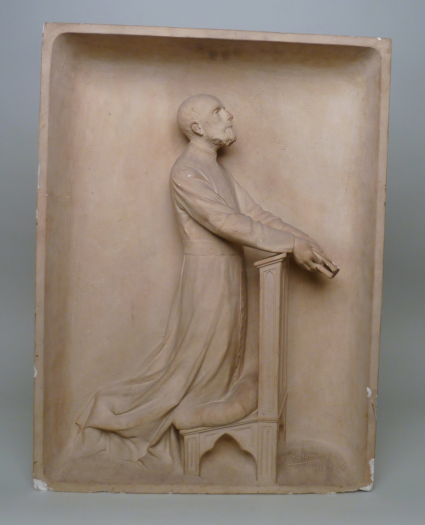 Reliëf met priester knielend op bidstoel