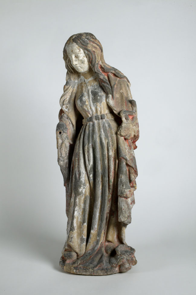Catharina is staande voorgesteld rustend op haar linkerbeen met elegant uitgebogen linkerheup. Haar gezicht is driekwart naar links gewend. Lange haarstrengen vallen over haar schouders. In haar linkerhand draagt zij haar attribuut, het gebroken rad. Naast haar linkervoet verschijnt het kopje van keizer Maxentius. Ze staat op een klein grondje. Catharina is gekleed in een ...