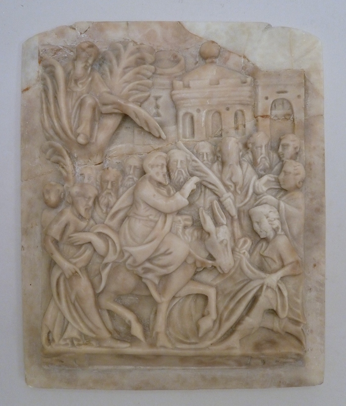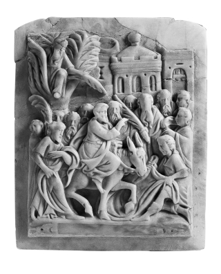 Voor een gezicht op de stad Jeruzalem rijdt Christus op de palmezel naar rechts. Hij houdt zijn rechterhand zegenend opgeheven, met zijn linkerhand houdt hij de teugels vast. Voor hem zit een figuur geknield, die een mantel voor hem op de grond uitspreidt. Op de achtergrond bevindt zich een grote groep gebaarde mannen, waarvan er ...