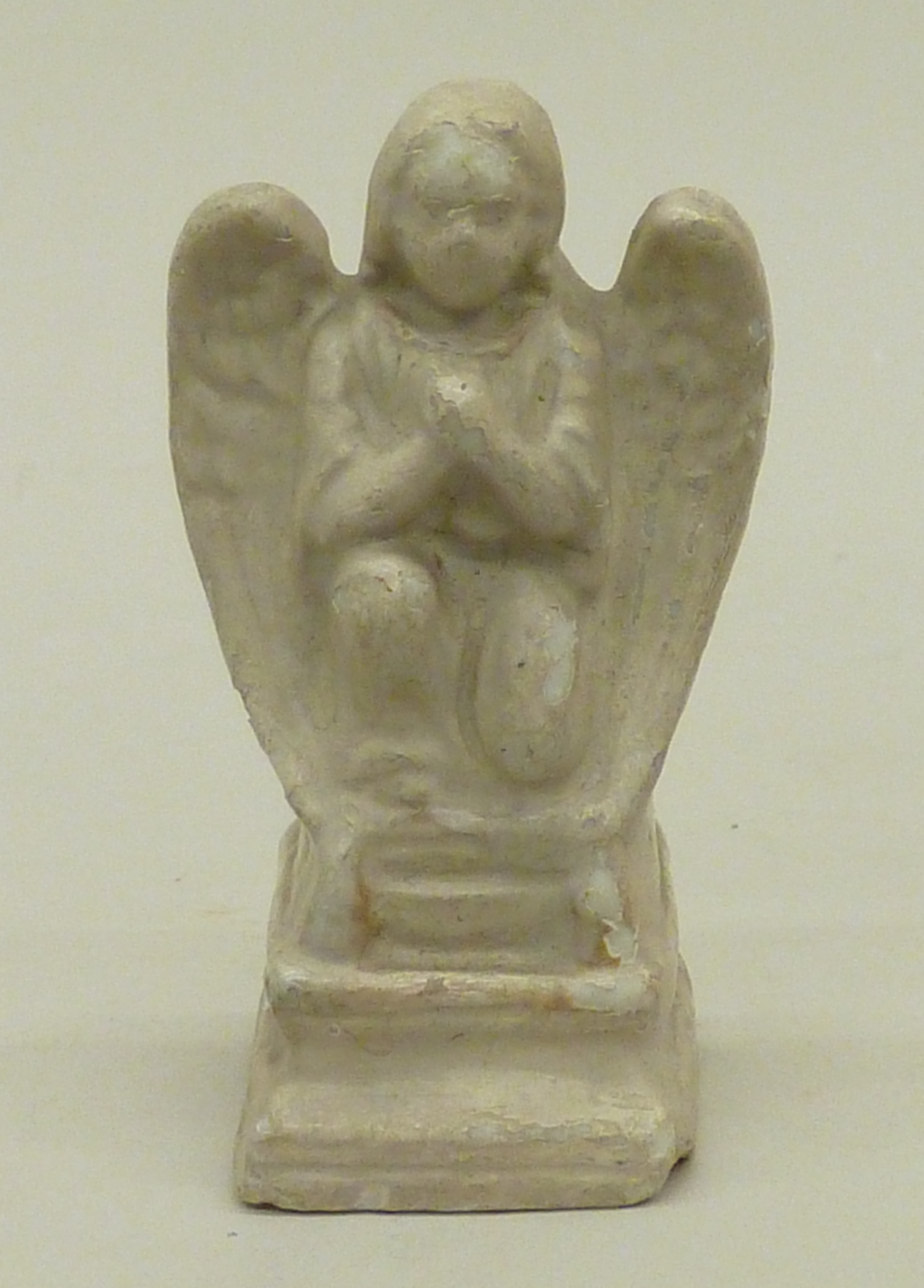 Engeltje, tweede van twee, op een knie op voetstukje, crème-wit overgeverfd