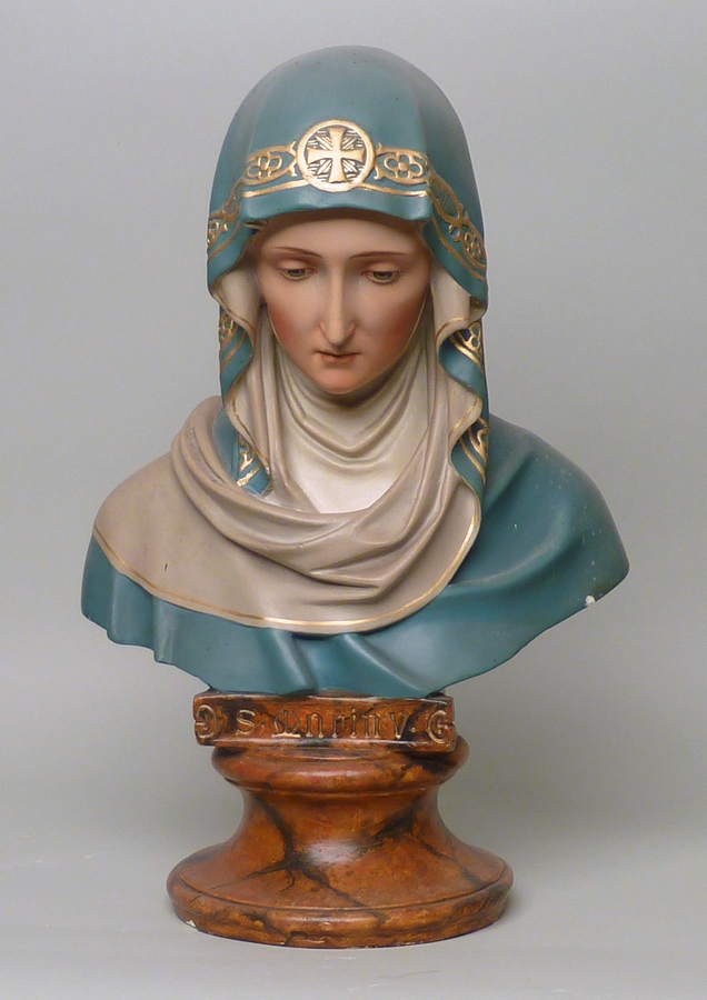 Borstbeeld van Maria in blauw en crème, marmerimitatie