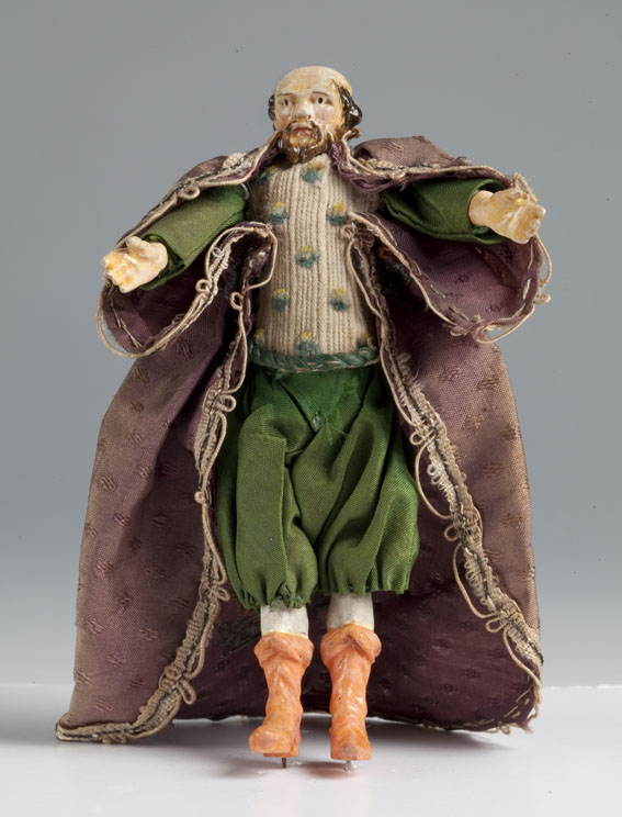 Knecht van Melchior, met baard, paarse cape en groene broek