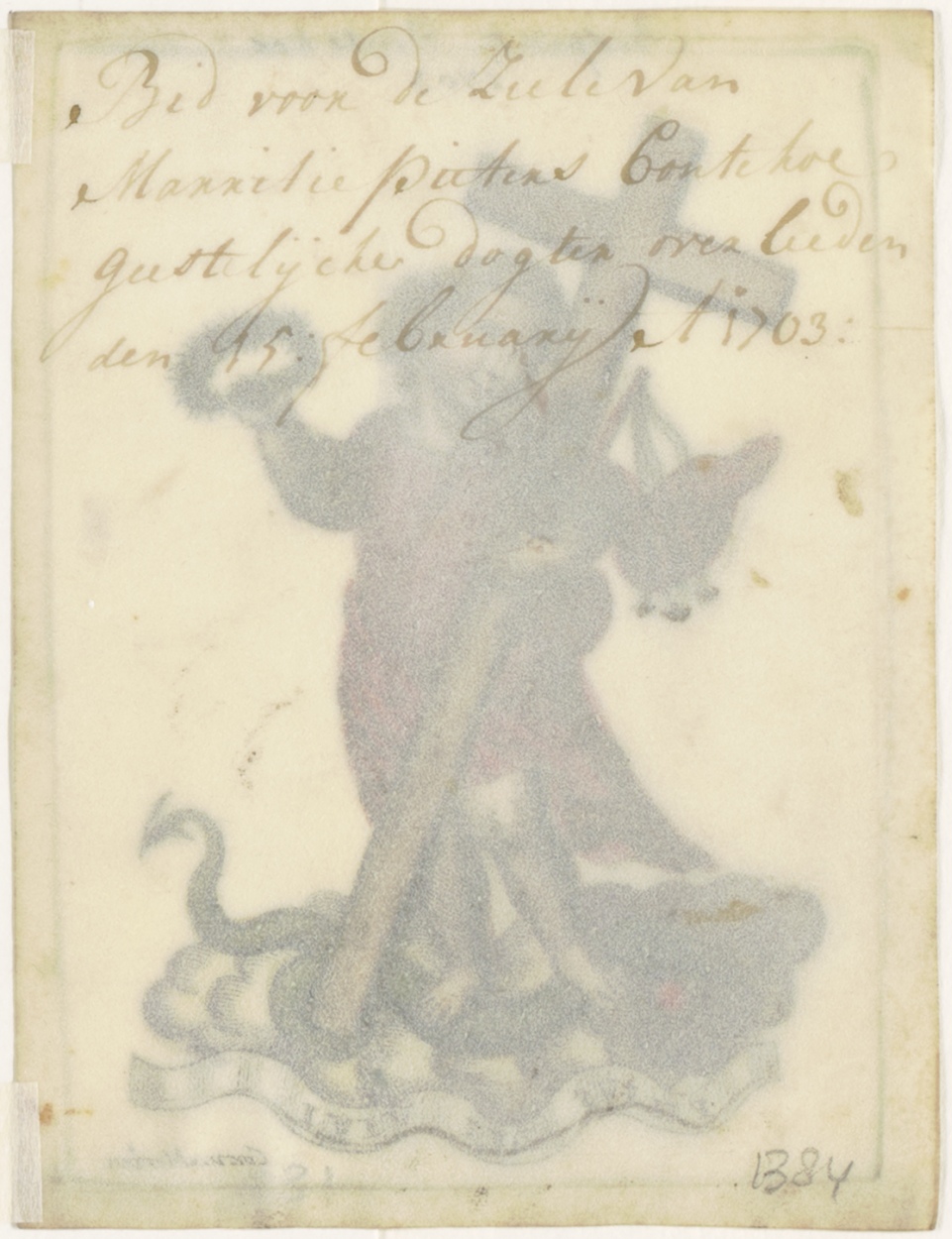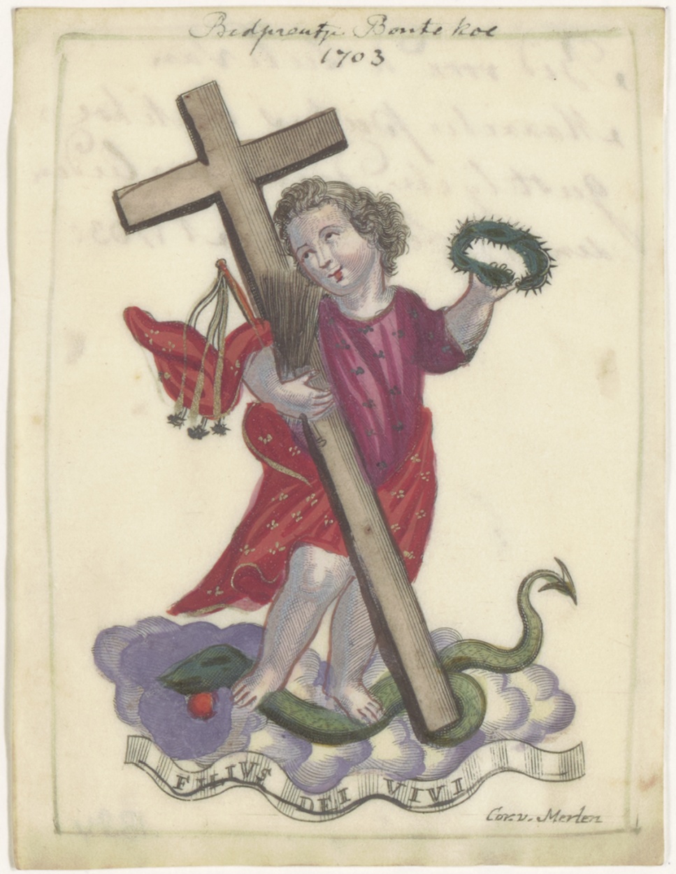 Christuskind met kruis, Filius dei Vivi, ingekleurd, kz. Religieus;Bid voor ziel Marietje Pieters Bontekoe;geestelijk dogter (+1703);