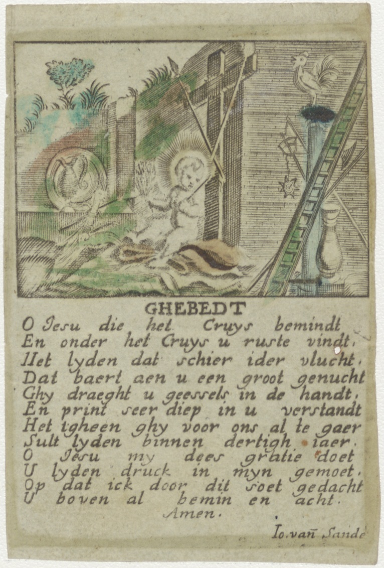 Christuskind met martelwerktuig, met gebed, ingekleurd