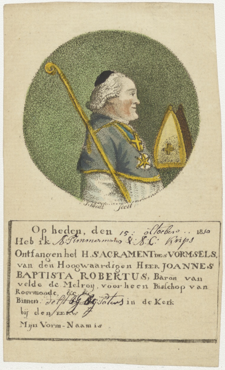 Portret van Joannes B.R. baron van Velde de Melroy, bisschop van Roermond met vormsel S. Timmermans en S.C. Krips (1810) in de Pauluskerk, ingekleurd