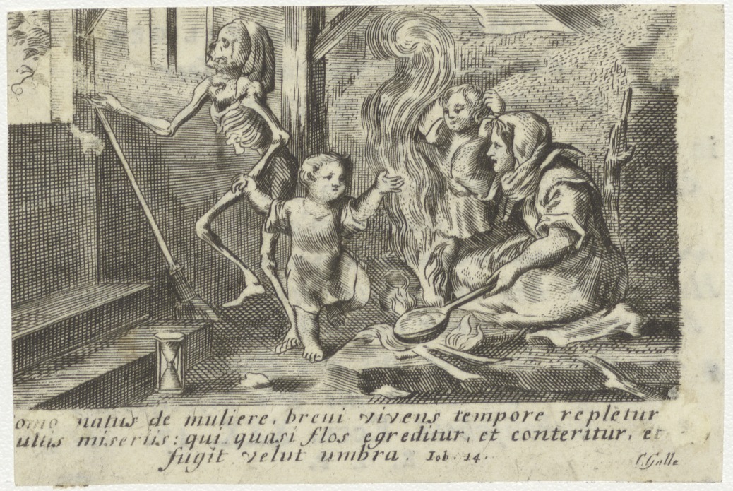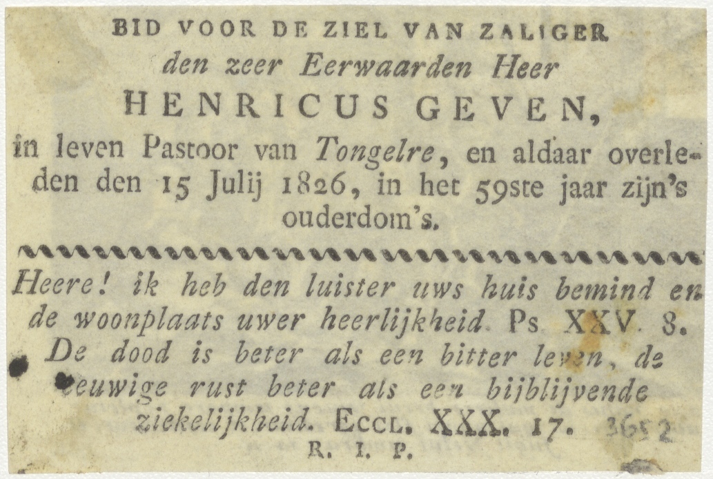 Kind wordt door de dood weggehaald bij de familie, kz. Religieus; bid voor ziel Henricus Geren (+1826) pastoor te Tongere
