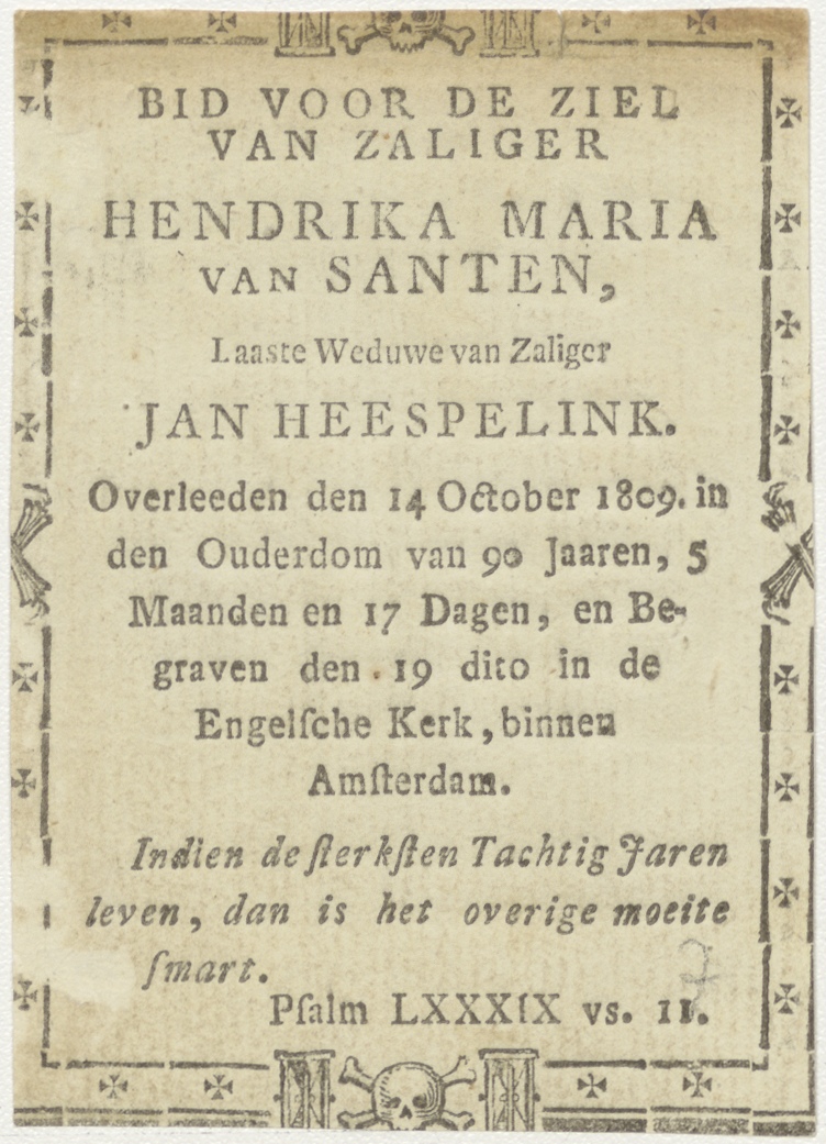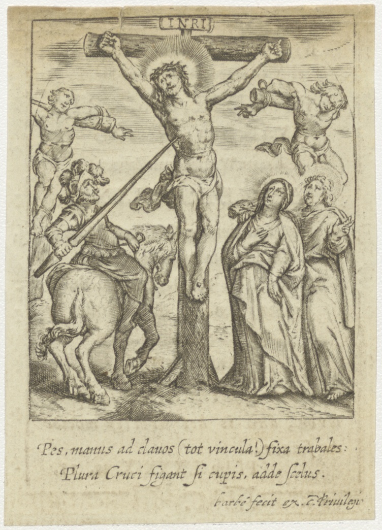 Kruisiging van Christus, Maria, Johannes, soldaat die hart doorboort, kz. Bid voor ziel Heesepelink-van Santen (+1809);Engelsche kerk Amsterdam;