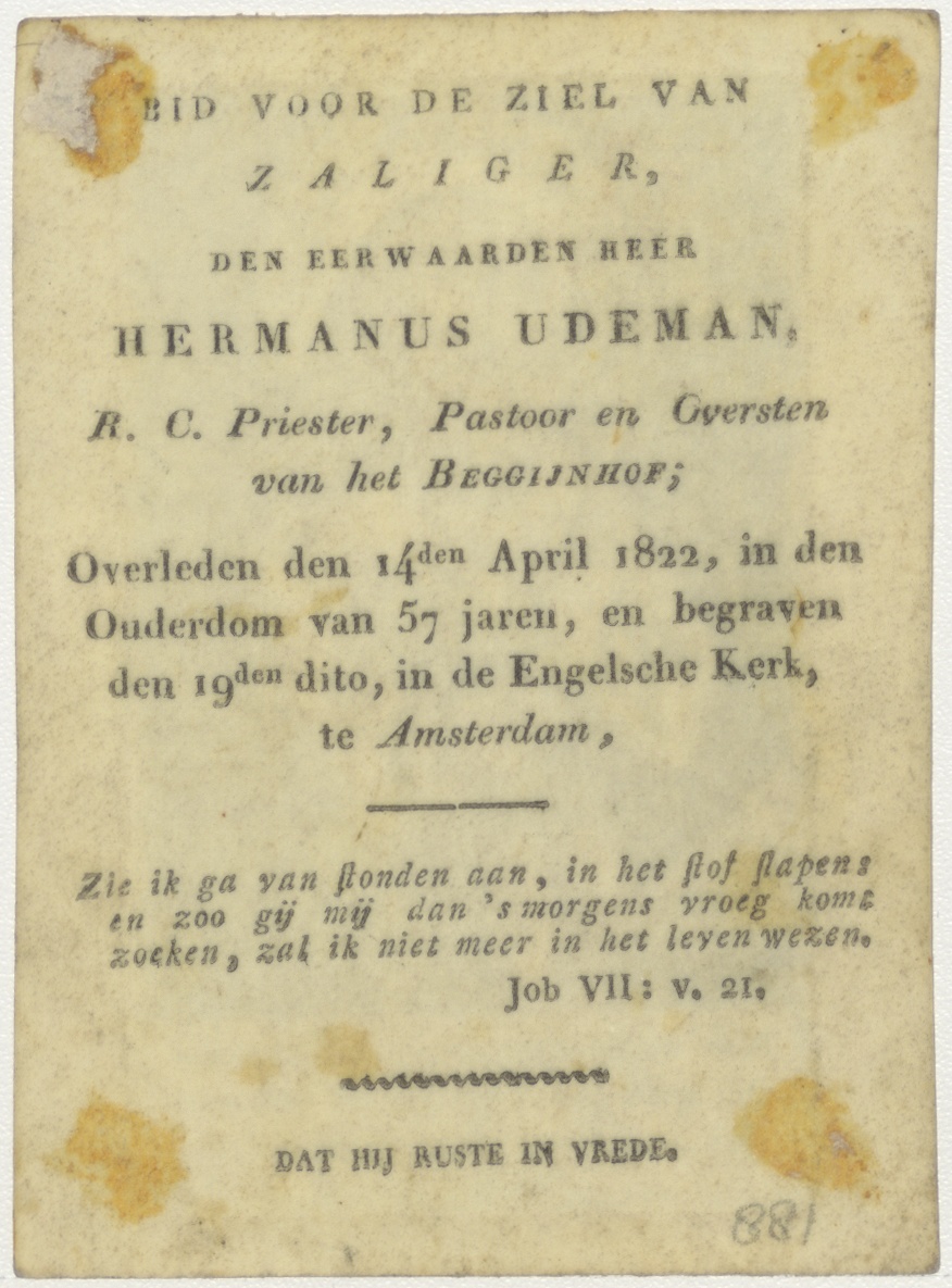 St. Franciscus met kruis, kz. Religieus;Bid voor ziel Hermans-Udeman (+1822);pastoor en oversten Begijnhof, etc.