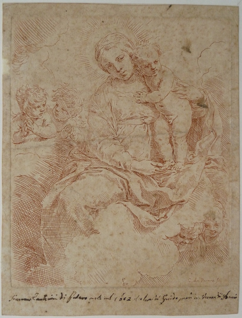 Maria met kind in de wolken, ets in rode inkt