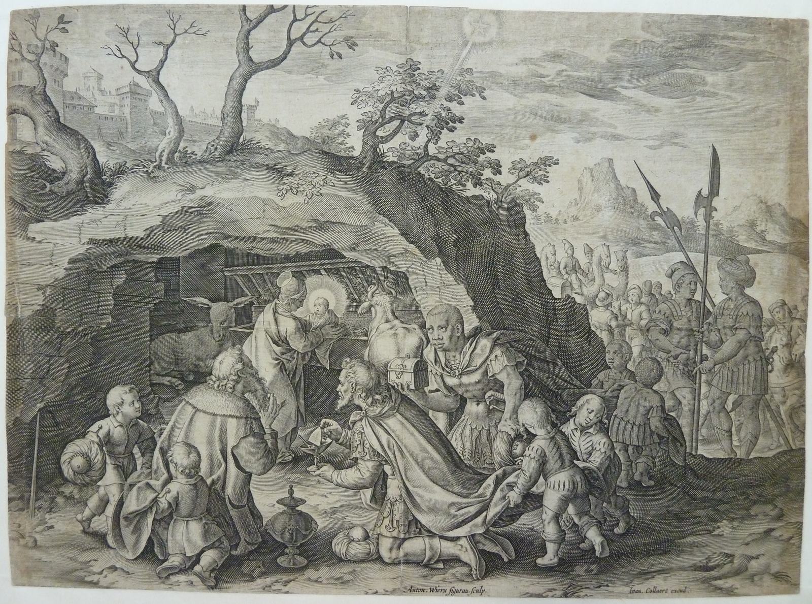 Aanbidding der koningen: Levendige compositie. Op de voorgrond knielen drie koningen, blootshoofds. De koning aan de linkerkant is gekleed in een mantel met brede bontkraag. Hij heeft beide handen gevouwen en kijkt naar Christus die op het middenplan is afgebeeld. Rechts van deze koning staat een stuk kostbaar vaatwerk op de grond. Aan zijn linkerkant ...