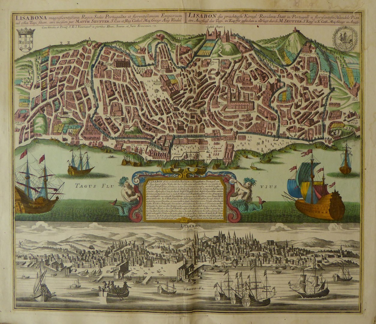 Kaart van Lissabon "Lisabon die prachtigste Konigl. Residenz Statt in Portugall...", ingekleurd