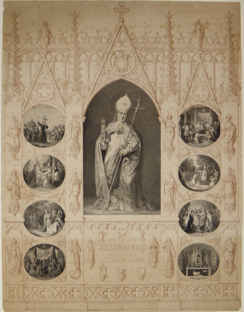 Willibrordus met scènes uit zijn leven, in neogotische omlijsting