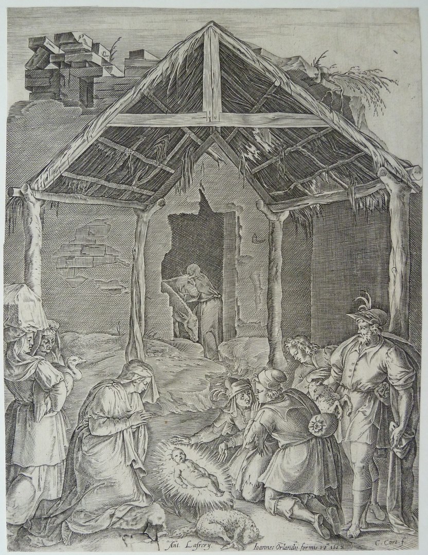 Aanbidding der herders: Op deze prent grote nadruk op de vervallen stal. Op de voorgrond ligt het naakte Christuskind op een met doeken bedekte verhoging in een stralenkrans. Voor Hem ligt een aan vier poten gebonden lam op de grond. Links van Hem ligt Maria geknield met gevouwen handen. Achter haar staan twee vrouwen. De ...
