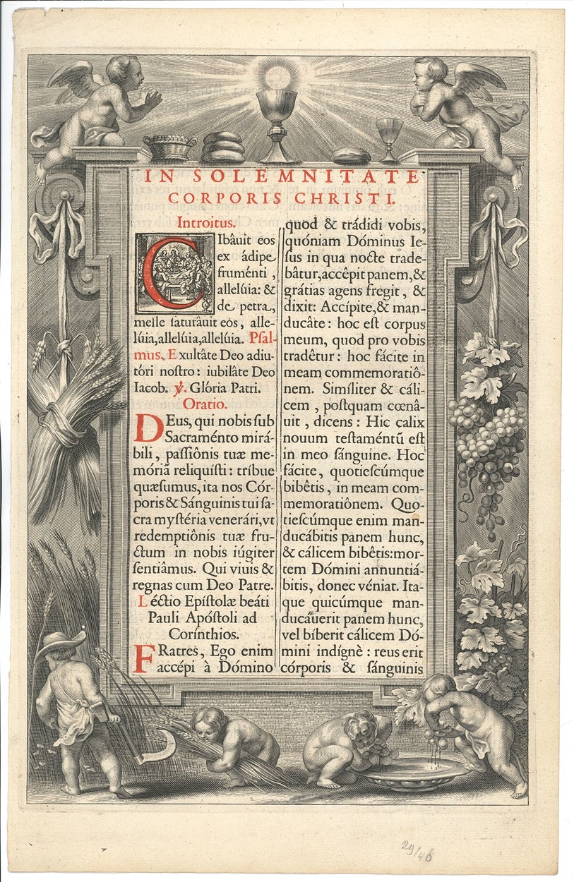 Missale Romanum: In solemnitate corporis Christi ..., engelen aanbidden de hostie, putti oogsten koren, persen druiven